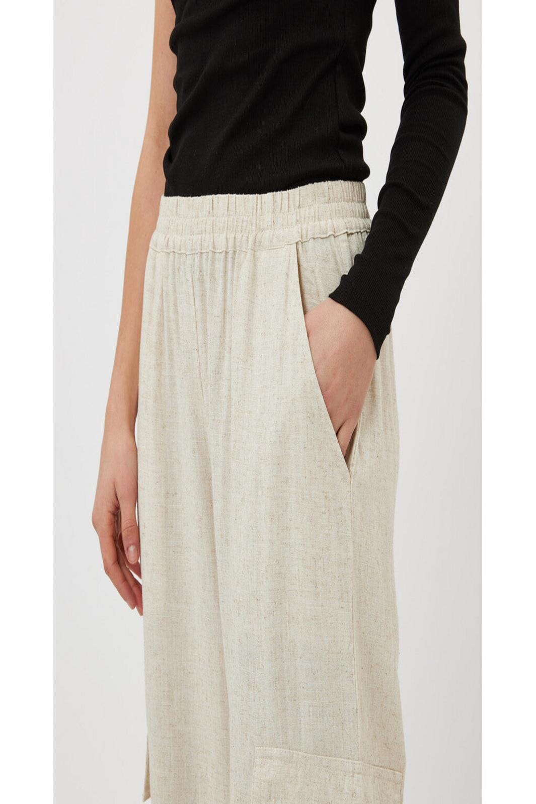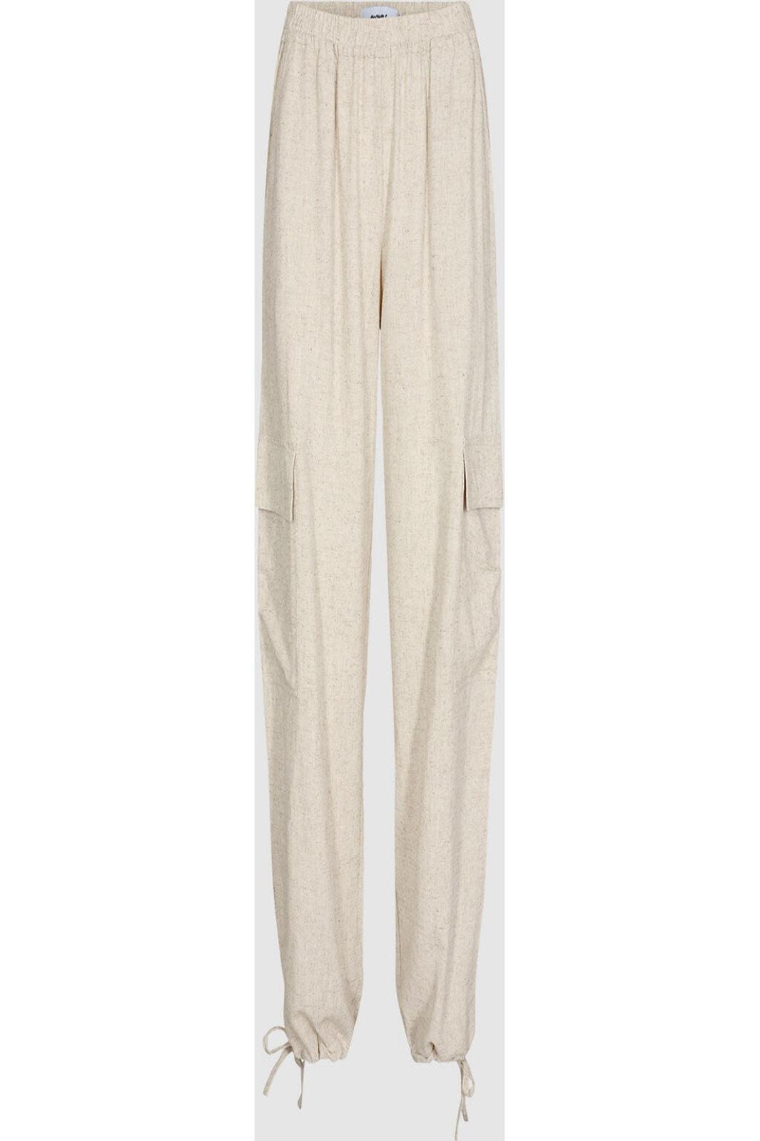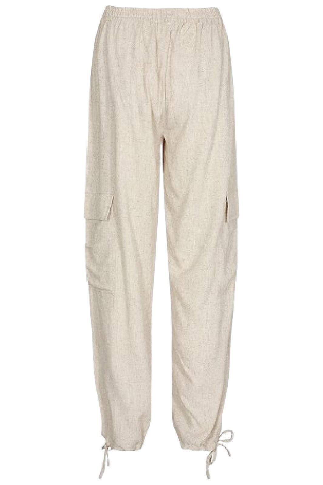 Cargo-Hosen von Moves aus sandfarbener Viskose und Leinen. Die Hosen haben eine lockere Passform mit elastischem Bund und Kordelzug, praktischen Cargo-Taschen und Kordeldetails an den Knöcheln.