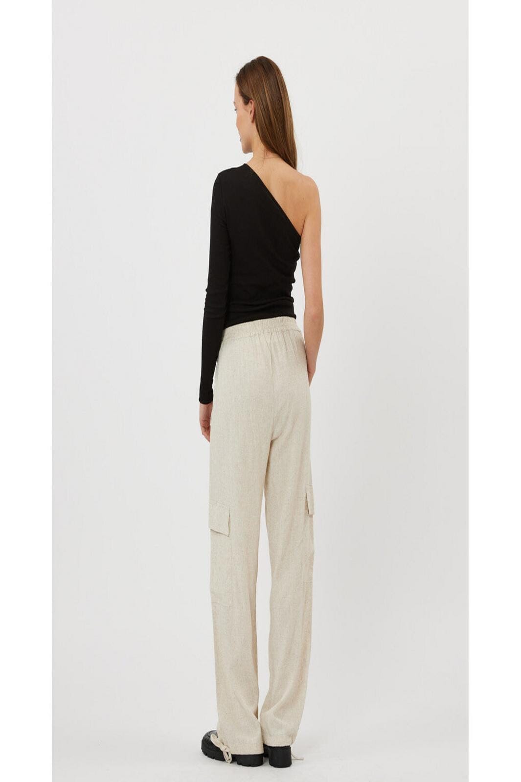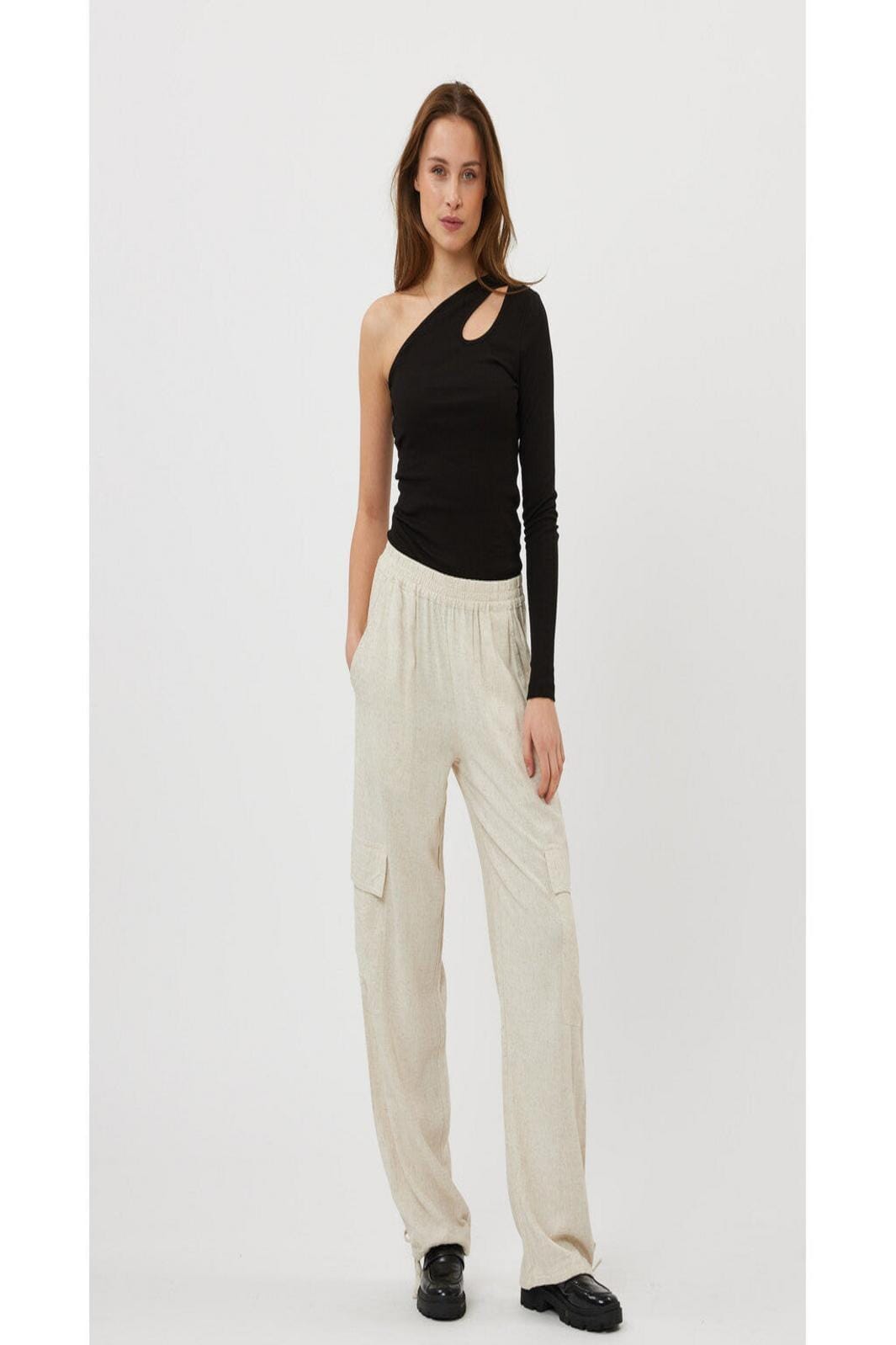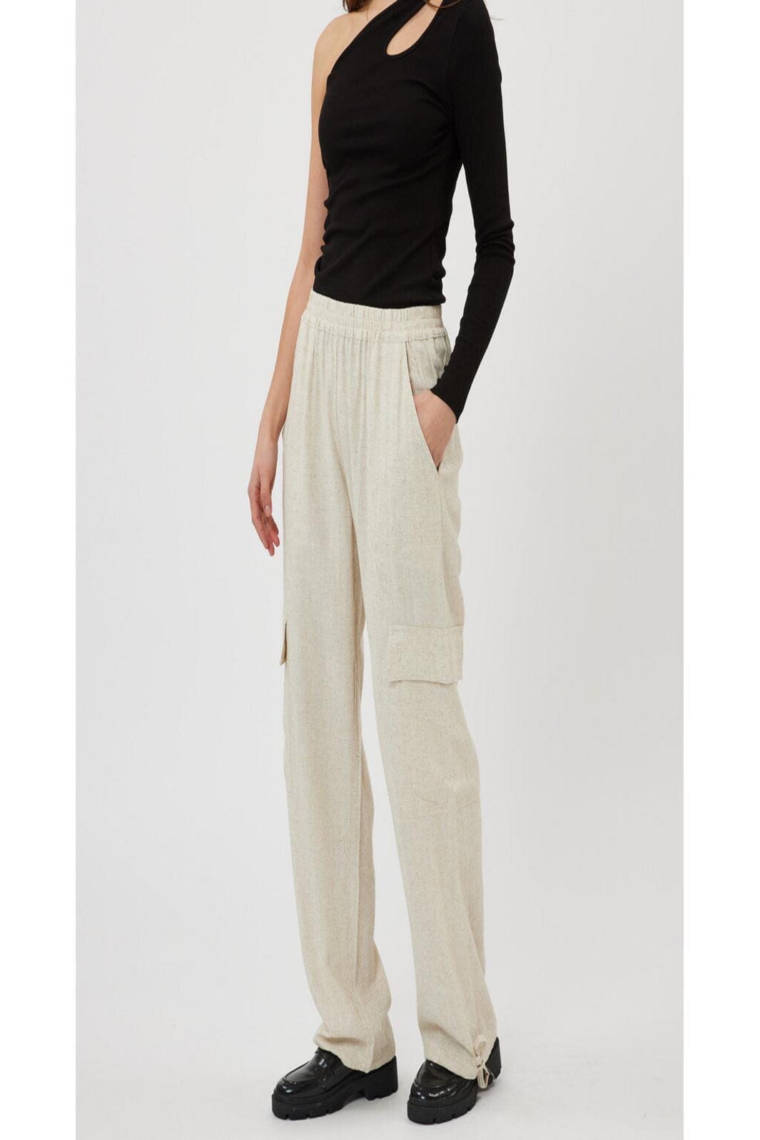 Cargo-Hosen von Moves aus sandfarbener Viskose und Leinen. Die Hosen haben eine lockere Passform mit elastischem Bund und Kordelzug, praktischen Cargo-Taschen und Kordeldetails an den Knöcheln.