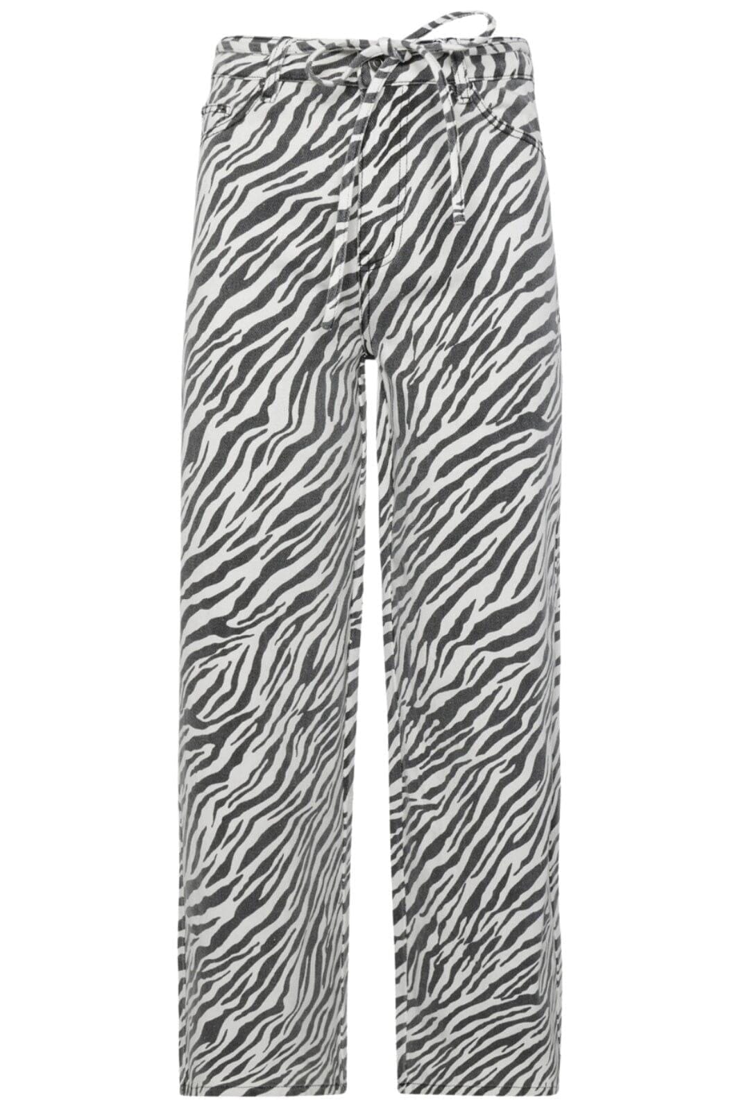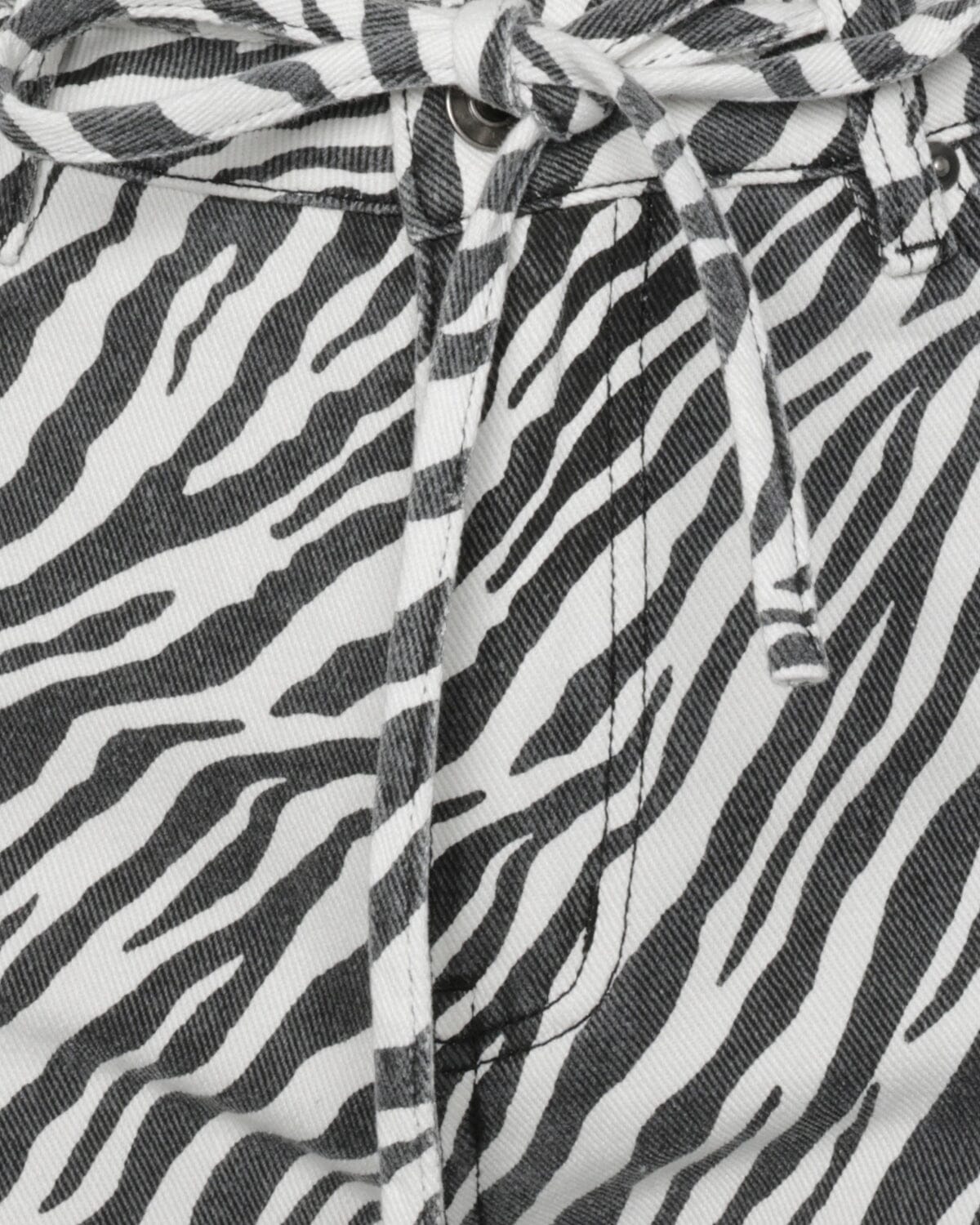 Jeans von Moves By Minimum mit Zebra-Muster in Schwarz und Weiß. Die Hose hat eine Schnürdetail in der Taille und ist knöchellang mit Regular Fit.