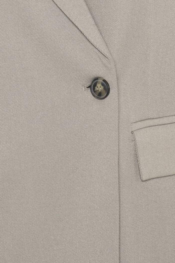 Beiger Blazer von Moves by Minimum mit oversized Passform und V-Ausschnitt. Er hat lange Ärmel, zwei Vordertaschen und einen einzelnen Knopf vorne.