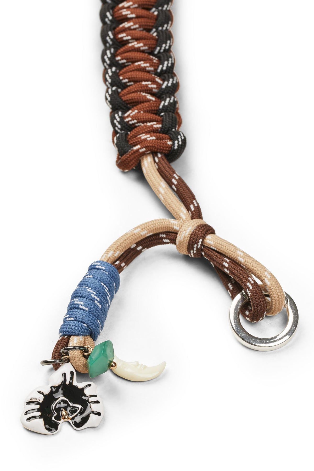 Schwarzer Schulterriemen von Munthe mit geflochtener Kordel in Braun-, Schwarz- und Beigetönen. Der Riemen hat dekorative Anhänger an den Enden.