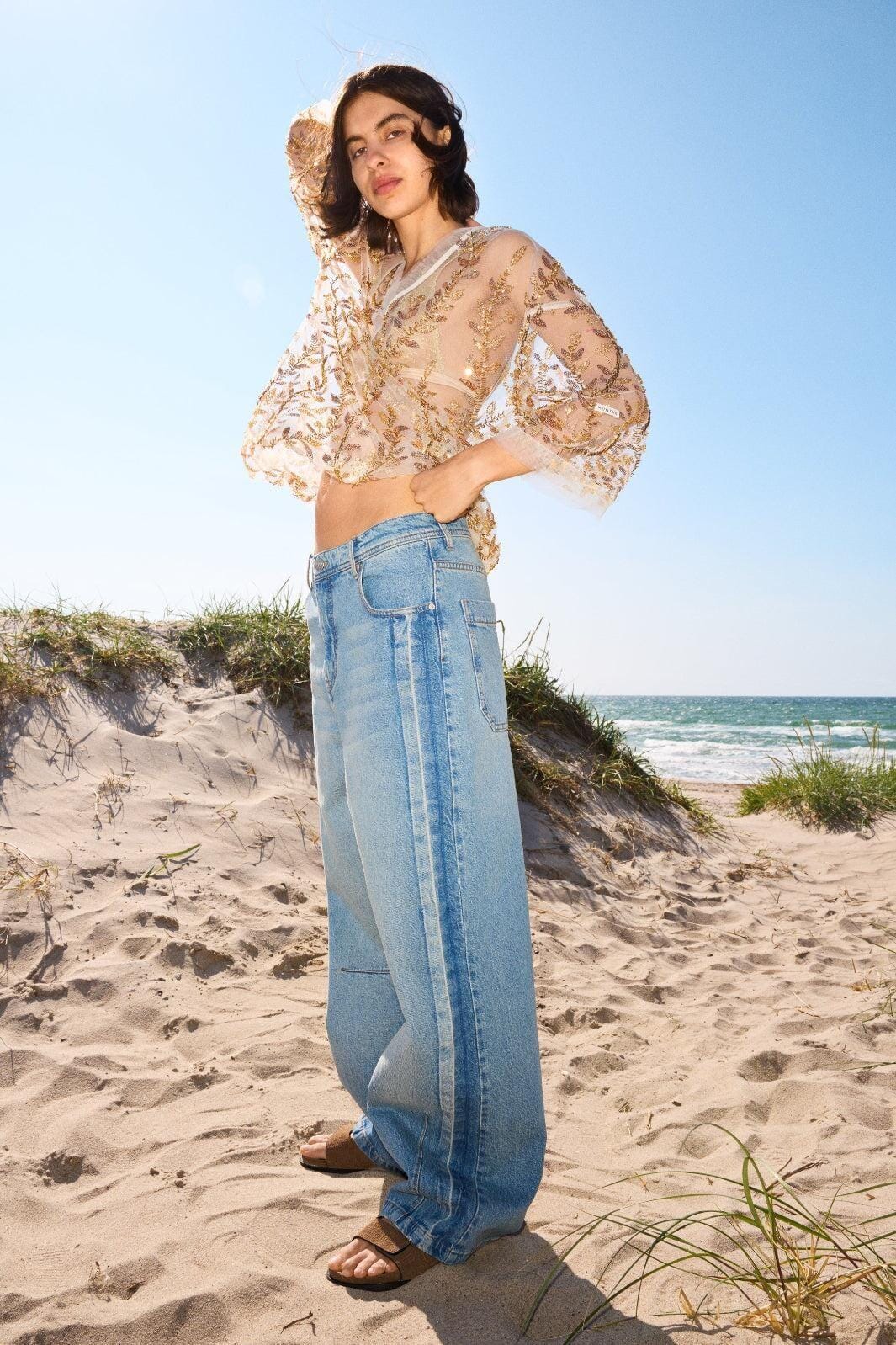 Blaue Jeans von Munthe mit weitem, legerem Schnitt. Die Hose hat eine hohe Taille, bodenlange Länge und gestreifte Einsätze an den Seiten aus dunklerem Denim.