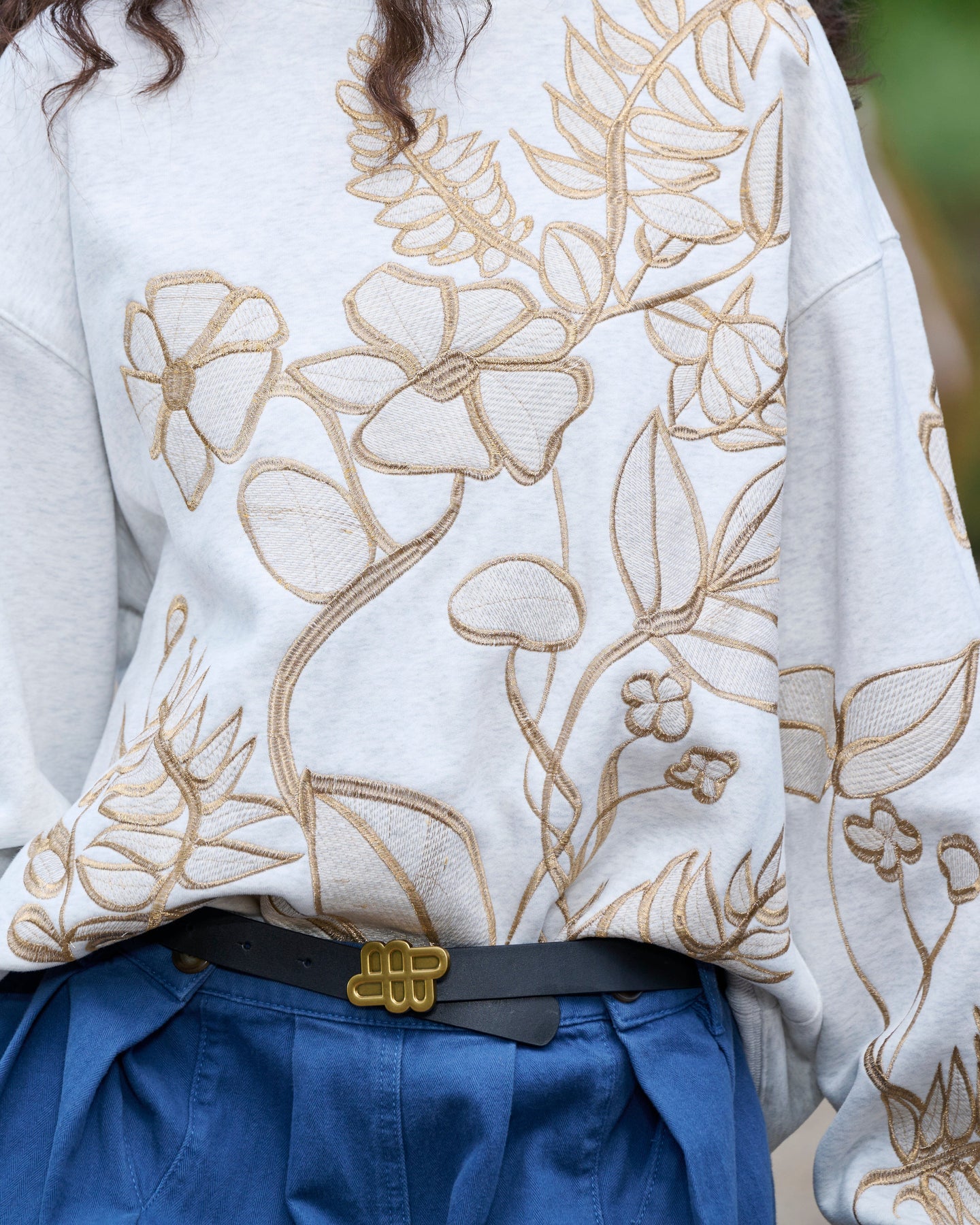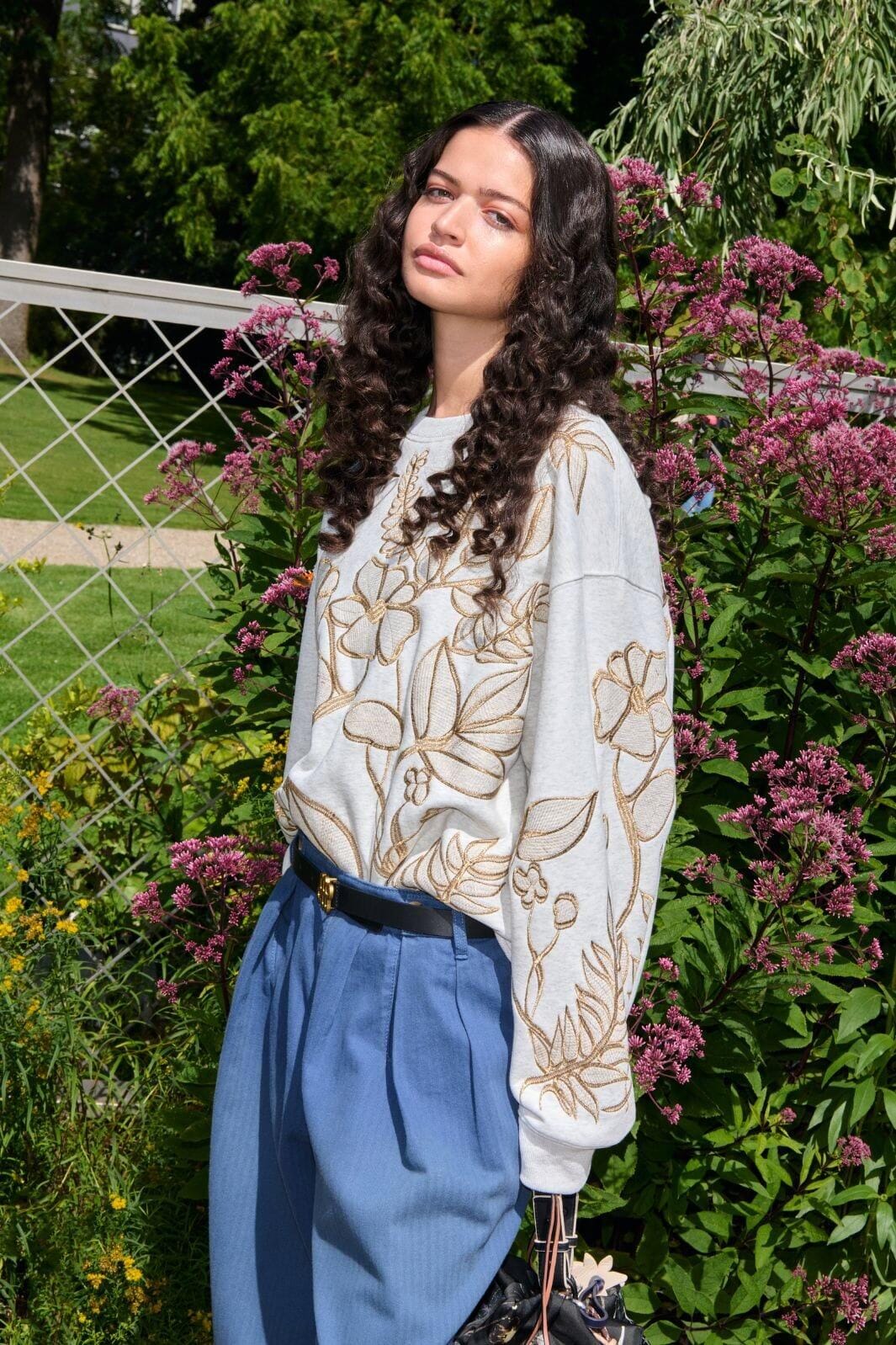 Hellgraues Sweatshirt von Munthe mit floraler Stickerei in Goldtönen auf der Vorderseite und an den Ärmeln. Oversize-Passform mit Rundhalsausschnitt und langen Ärmeln.