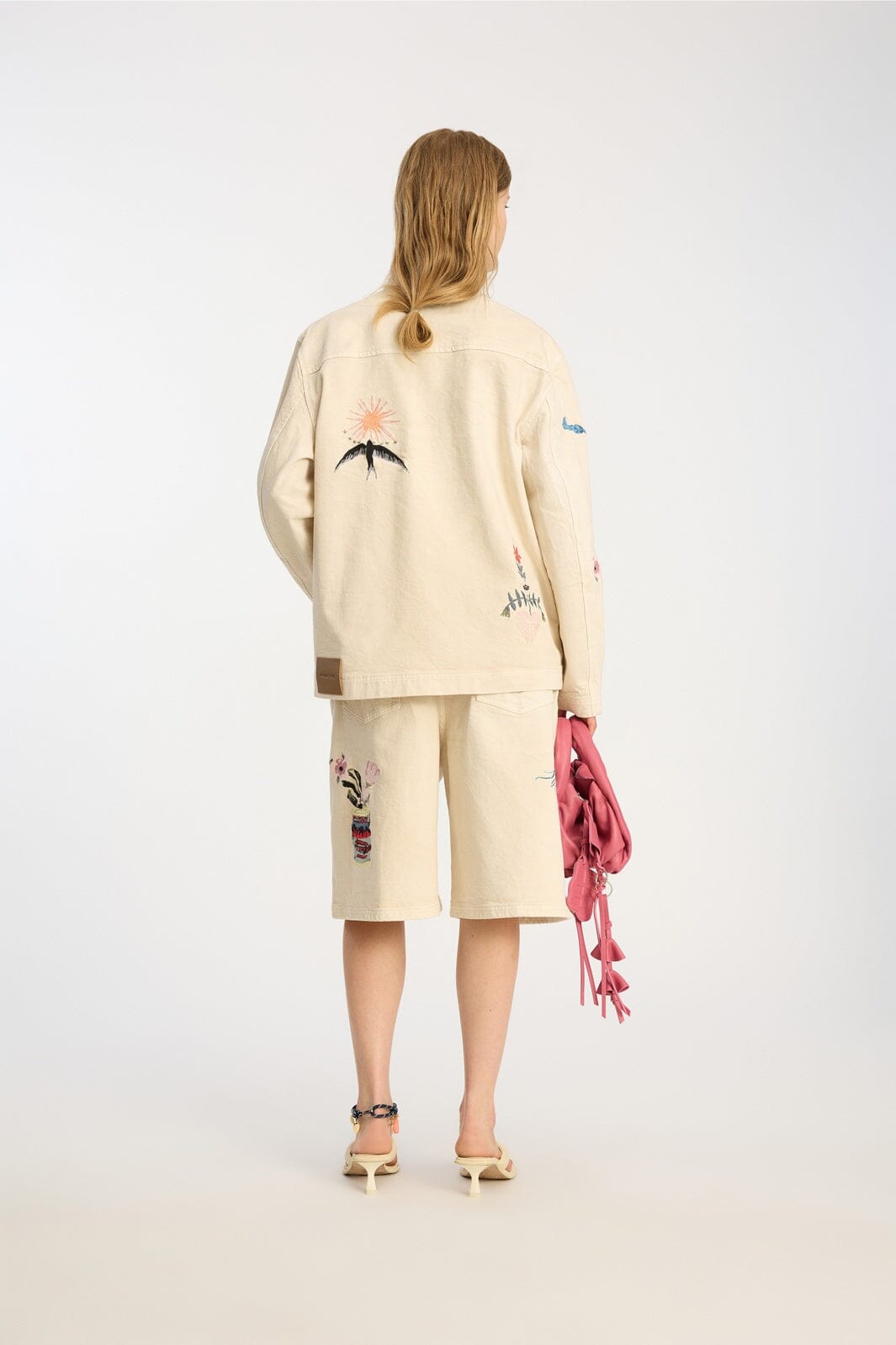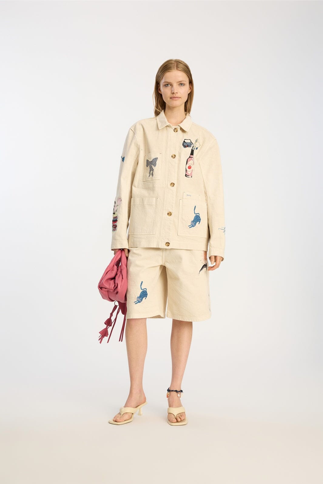 Beige Jacke von Munthe, gefertigt aus 99 % Bio-Baumwolle und 1 % Elasthan. Die Jacke hat eine lockere Passform und ist mit mehreren gestickten Motiven verziert.