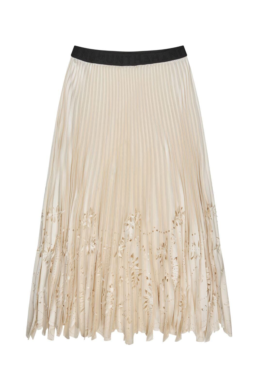 Plissierter Rock von Munthe in einem cremeähnlichen Off-White-Ton. Der Rock besteht aus 100 % recyceltem Polyester und hat laser geschnittene Blütenausschnitte im unteren Bereich.