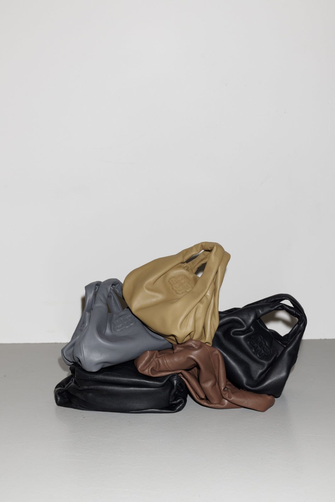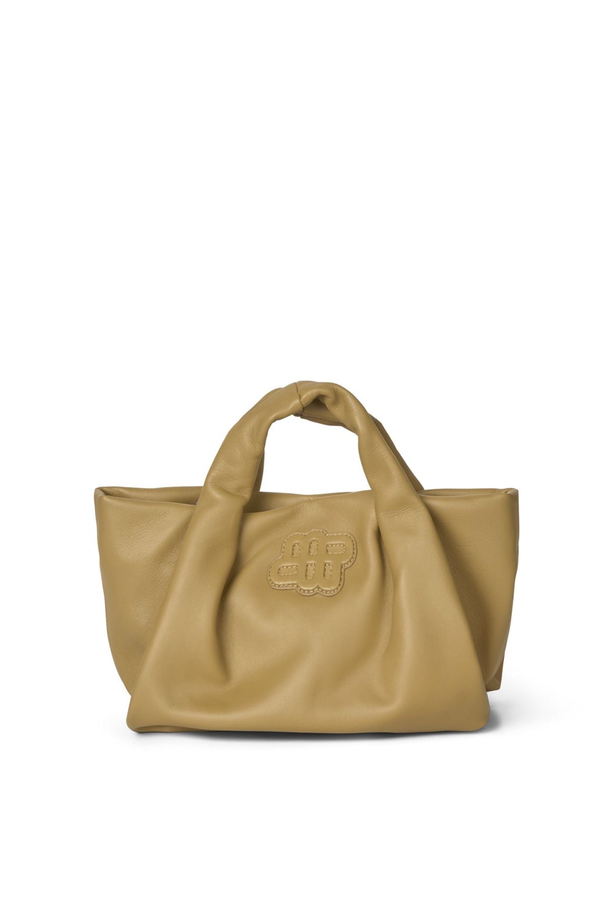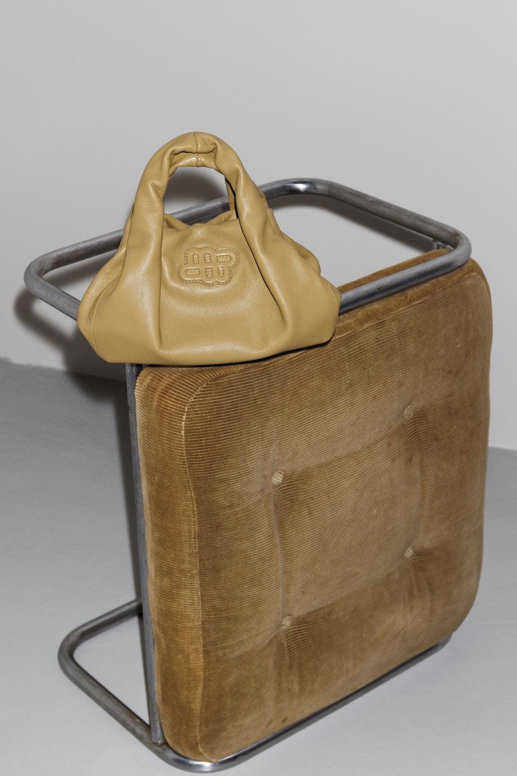 Goldene Handtasche von Munthe aus weichem Lammleder. Die Tasche hat eine abgerundete Form mit kurzem Griff und ein eingraviertes Logo auf der Vorderseite. Ein abnehmbarer Schulterriemen bietet mehrere Tragemöglichkeiten.