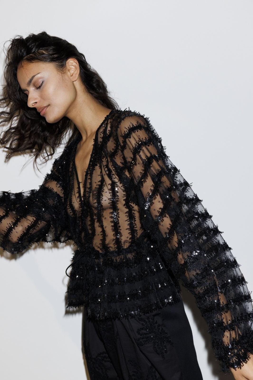 Schwarze, transparente Bluse von Munthe mit horizontalen Paillettenstreifen. Die Bluse hat einen tiefen V-Ausschnitt und eine lockere Passform mit langen, leicht gepufften Ärmeln.