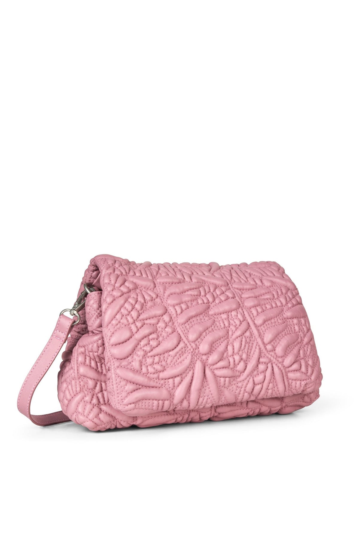 Rosa Schultertasche von Munthe, gefertigt aus weichem Lammleder mit gestepptem Blumenmuster. Die Tasche hat einen Magnetverschluss und einen verstellbaren Schulterriemen.