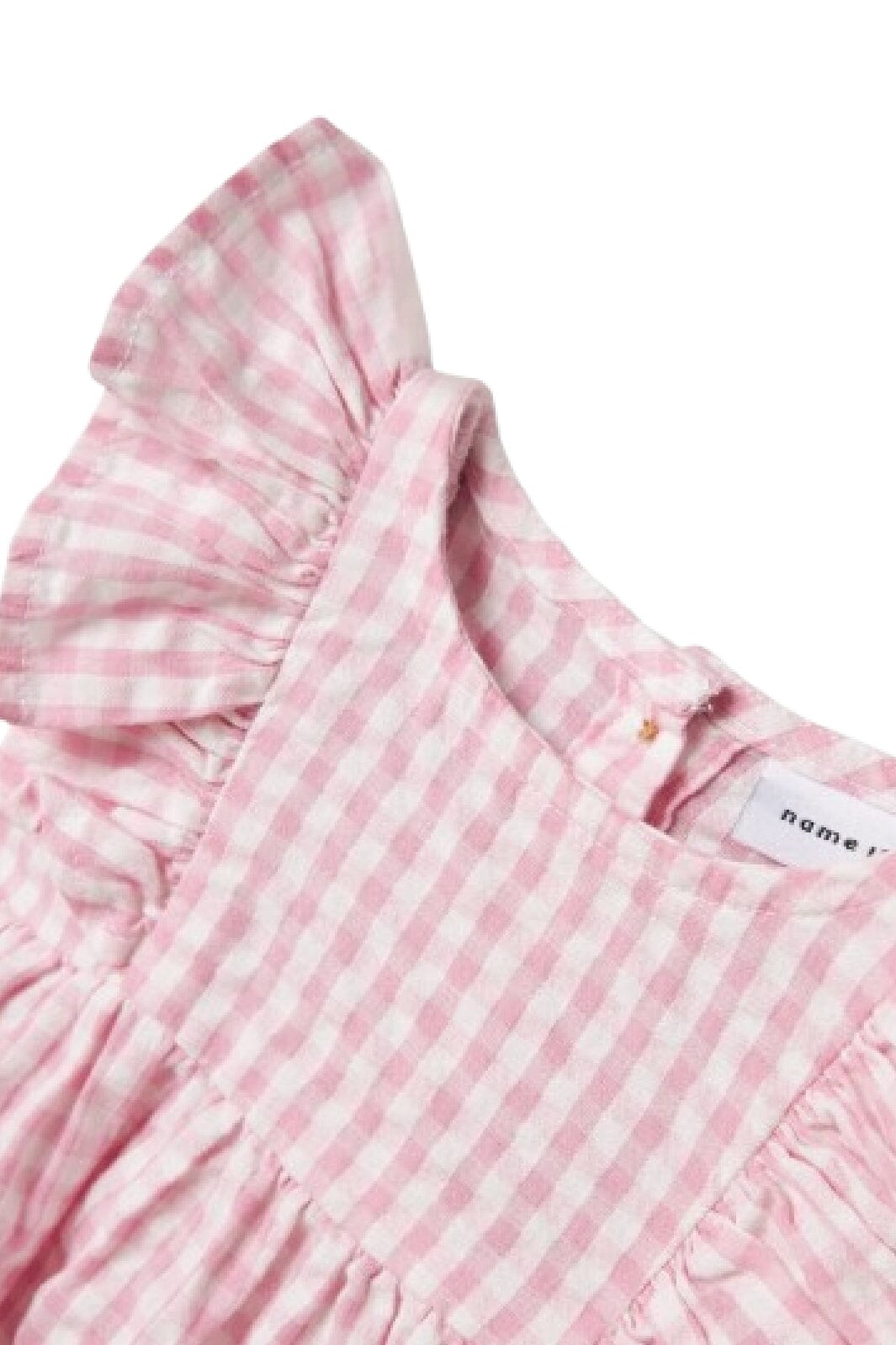 Rosa Spenzer von Name It mit kariertem Muster. Das ärmellose Kleid hat Rüschensäume entlang der Armausschnitte und wird mit drei Knöpfen im Rücken geschlossen. Rundhalsausschnitt und Oberschenkellänge.