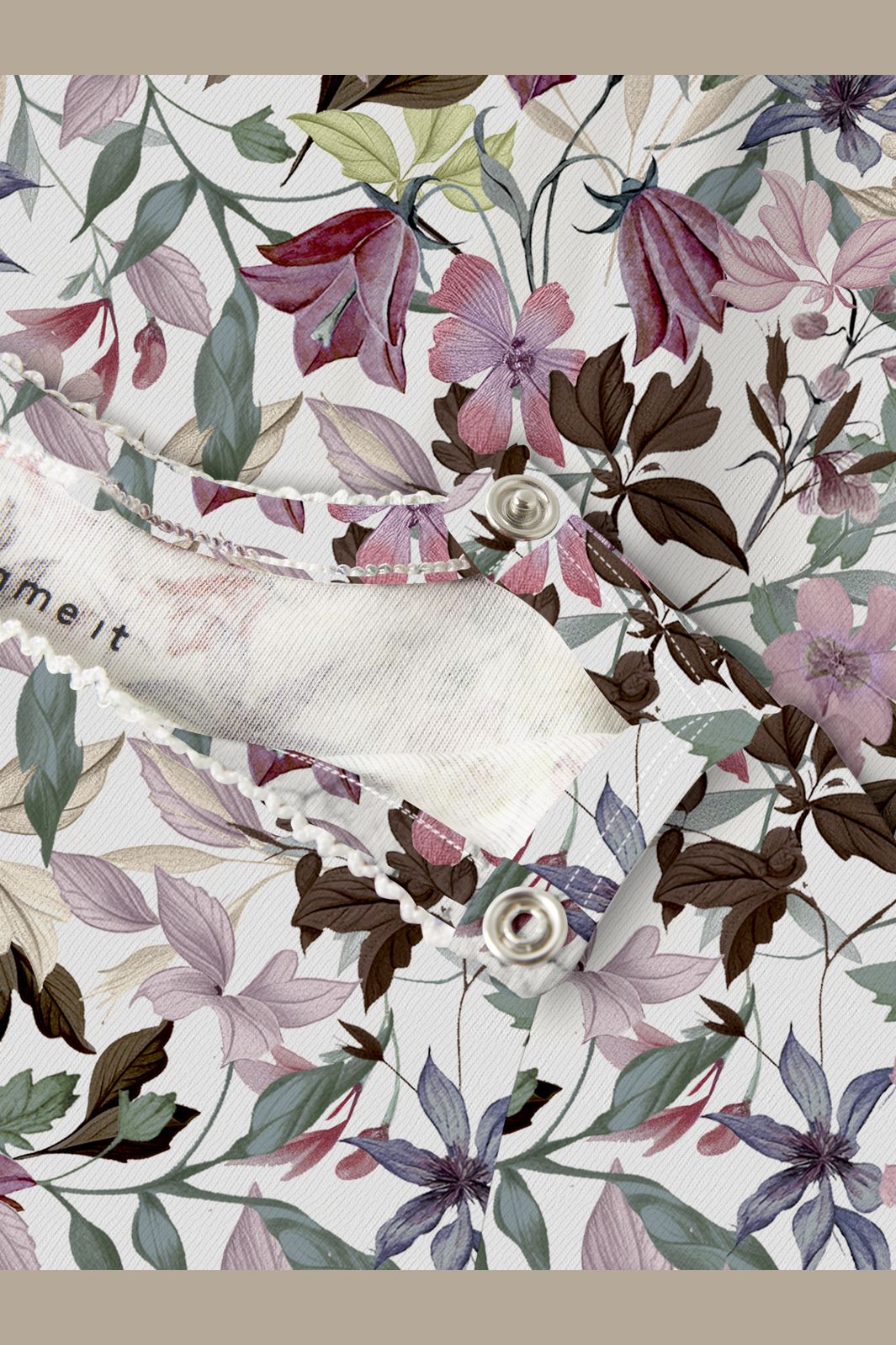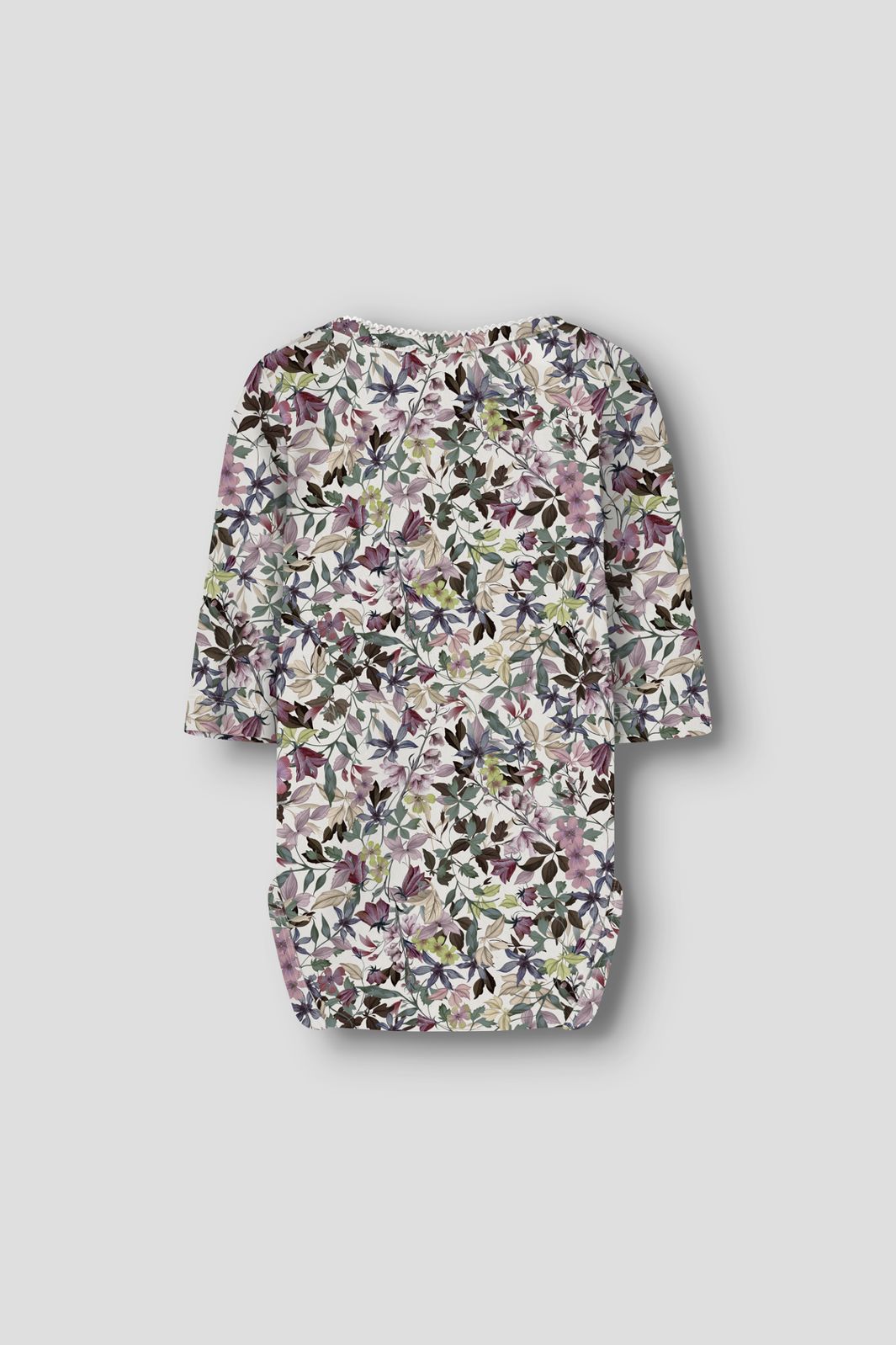 Langärmeliger Body von Name It mit Blumenmuster in grünen, cremefarbenen, weißen und lila Tönen. Der weiche Jersey hat einen runden Halsausschnitt mit Druckknöpfen.