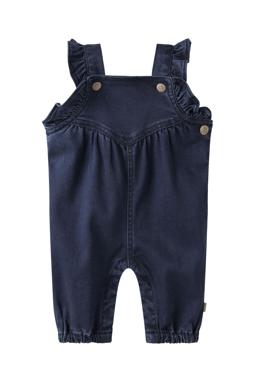 Dunkelblaue Denim-Jumpsuit mit Rüschen-Details an den Trägern. Sie hat einen Knopfverschluss vorne und im Schritt sowie elastische Beinabschlüsse in Knöchellänge.