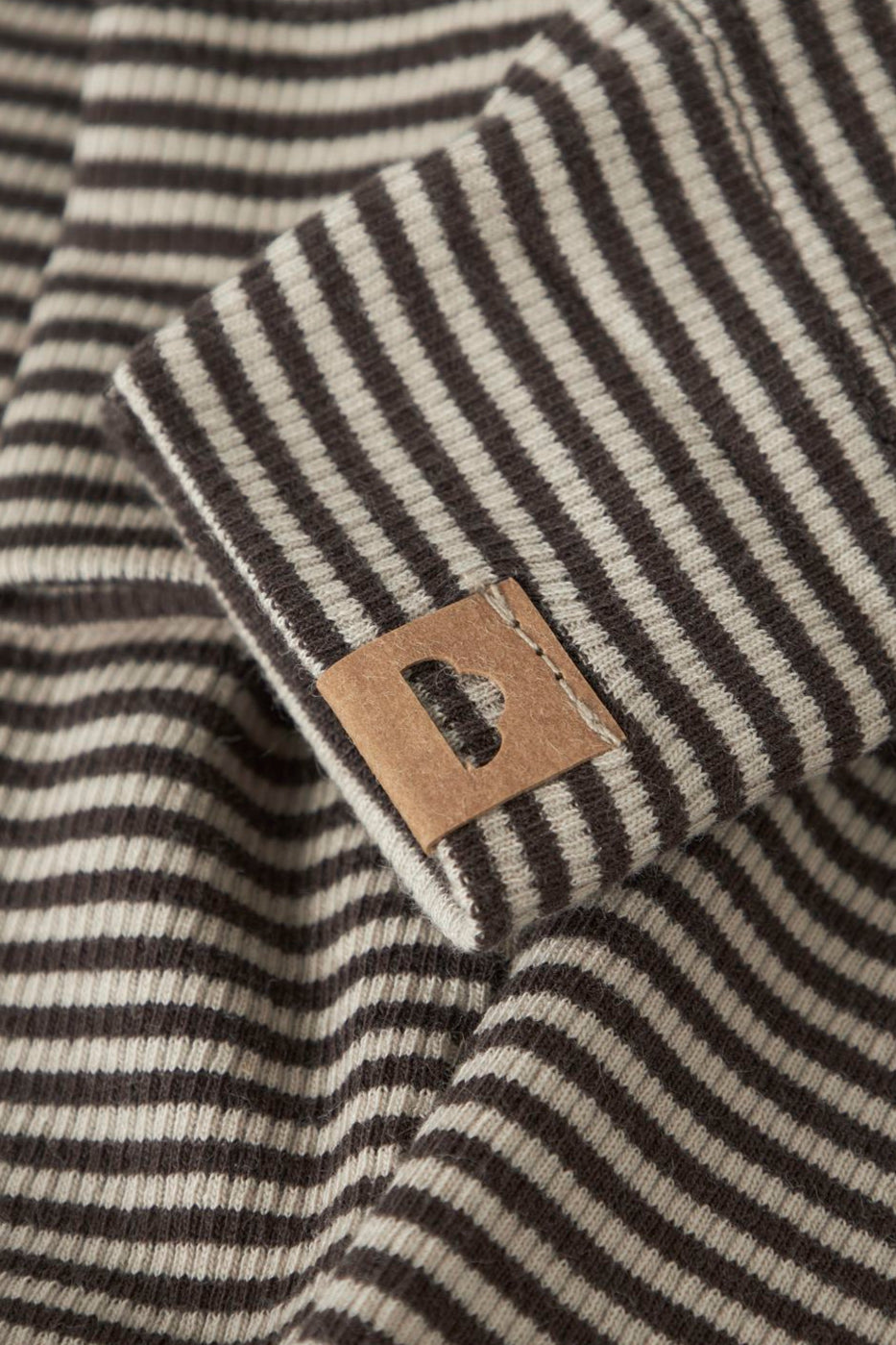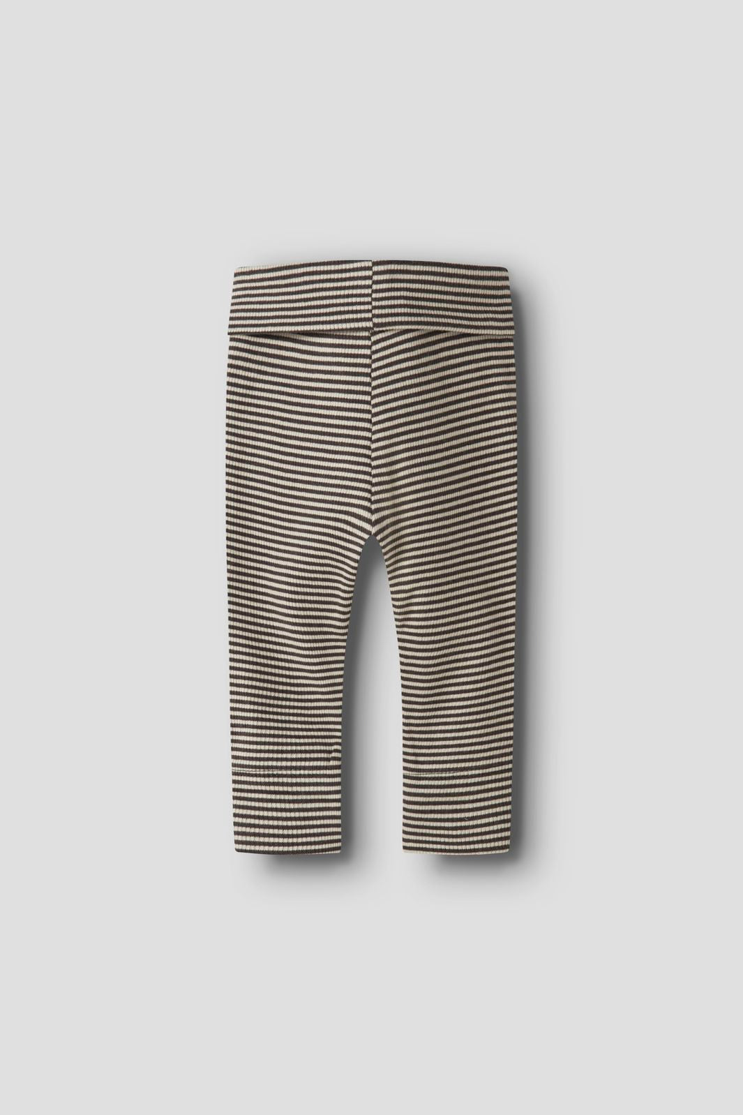 Lange Unterhosen von Name It in Rippstrick mit Streifen in beige und braunen Tönen. Die Hosen haben einen elastischen Bund und eine reguläre Passform mit einem kleinen braunen Etikett am Bein.