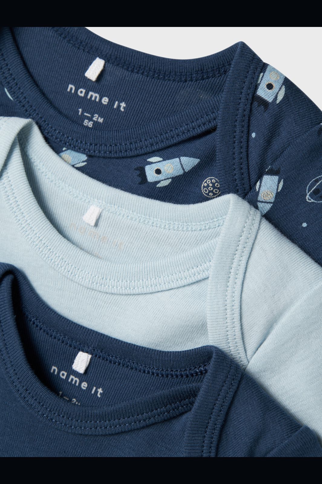 Langærmet body fra Name It i mørkeblå med rumtema. Bodyen fås også i ensfarvet lyseblå. Begge varianter har print med raketter og planeter eller ensfarvet design.