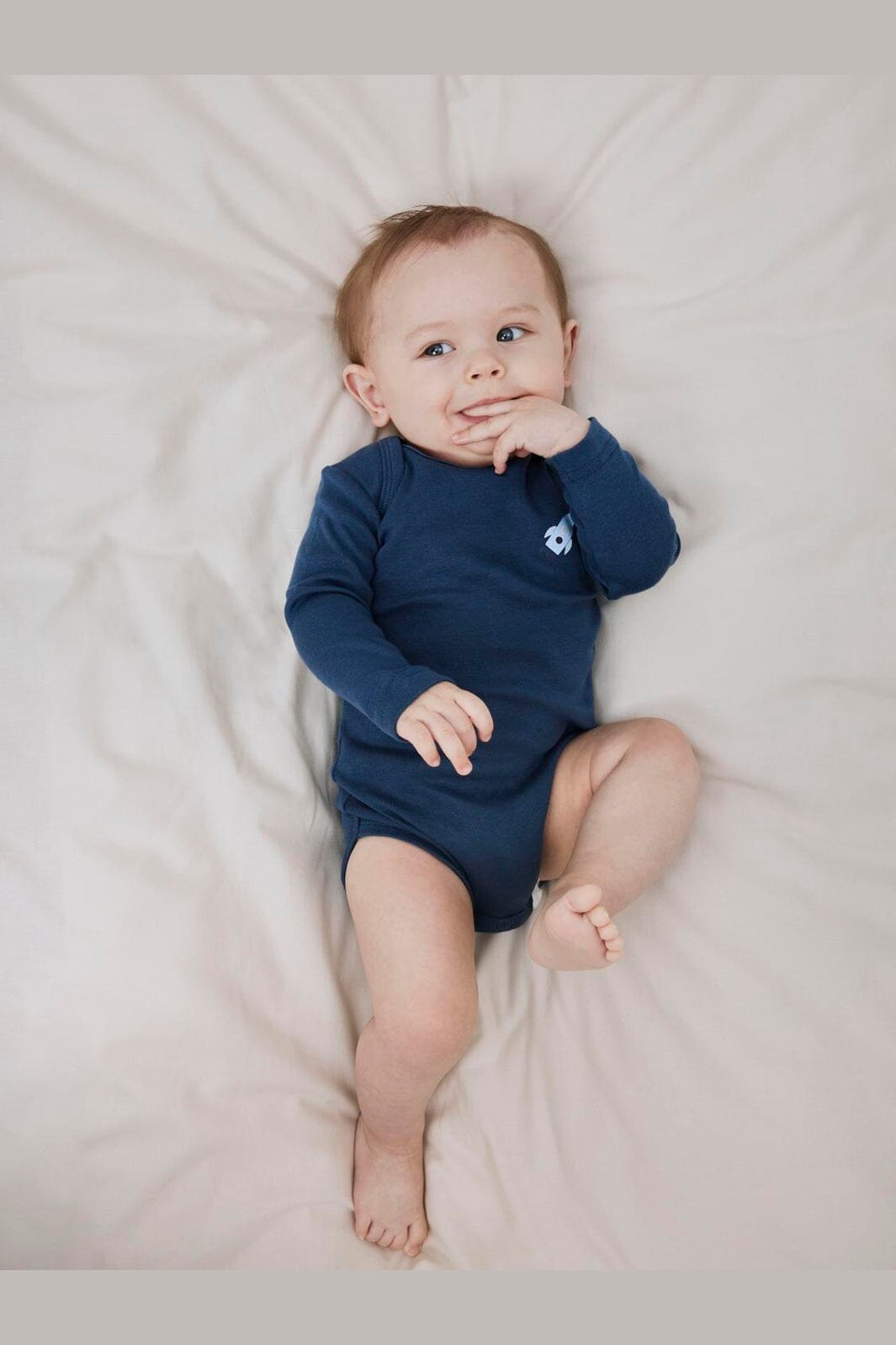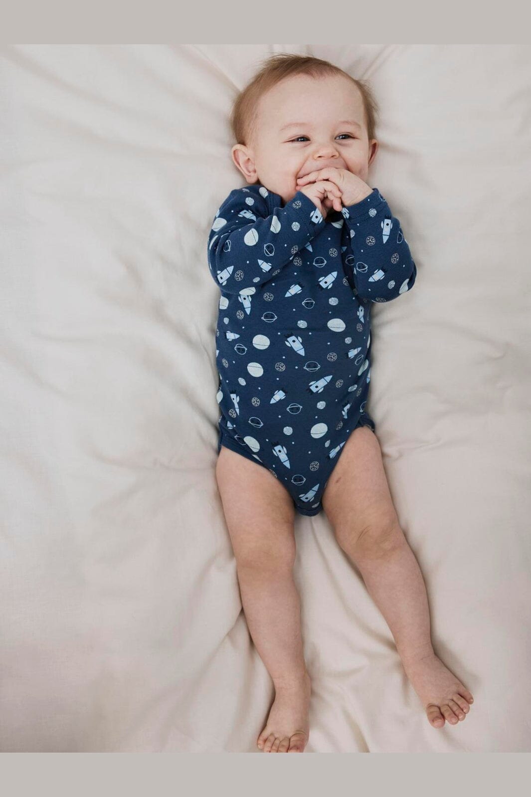 Langærmet body fra Name It i mørkeblå med rumtema. Bodyen fås også i ensfarvet lyseblå. Begge varianter har print med raketter og planeter eller ensfarvet design.