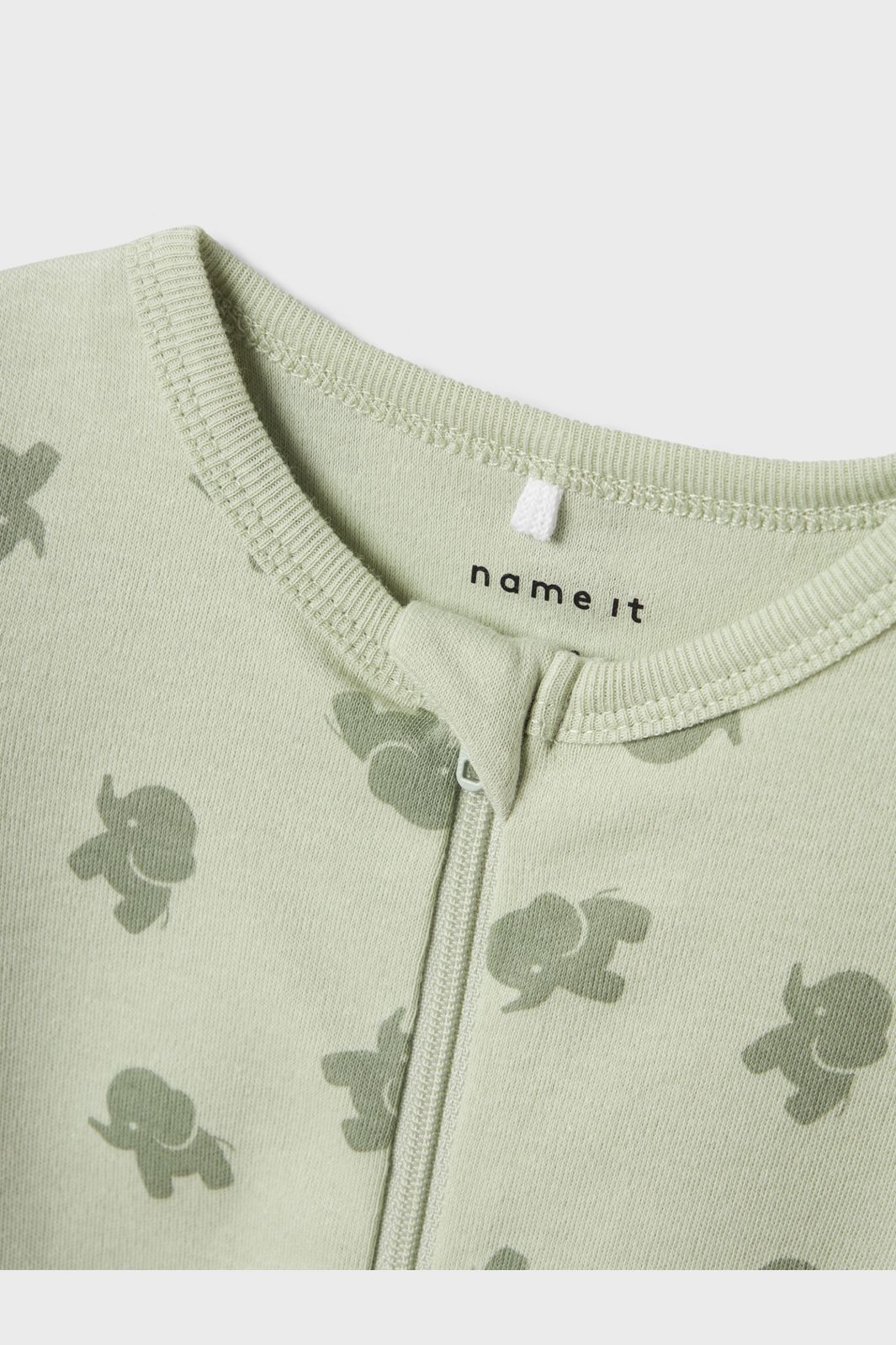 Schlafanzug von Name It in hellgrüner Farbe mit Elefantenprint. Der Anzug hat einen Reißverschluss von Hals bis Bein und besteht aus einer Mischung aus Bio-Baumwolle und normaler Baumwolle.