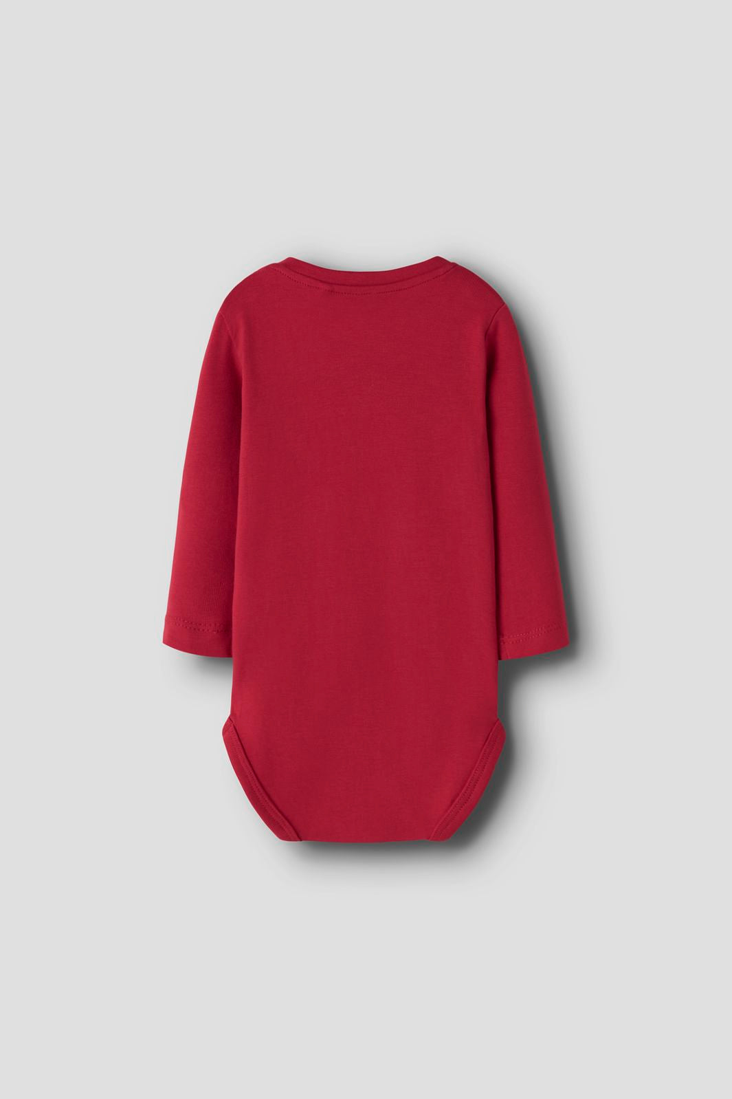 Roter Body von Name It aus weichem Jersey mit Weihnachtsbaum-Motiv und dem Text Mein erstes Weihnachten. Der Body hat lange Ärmel und Druckknöpfe an der Schulter, die das An- und Ausziehen erleichtern.