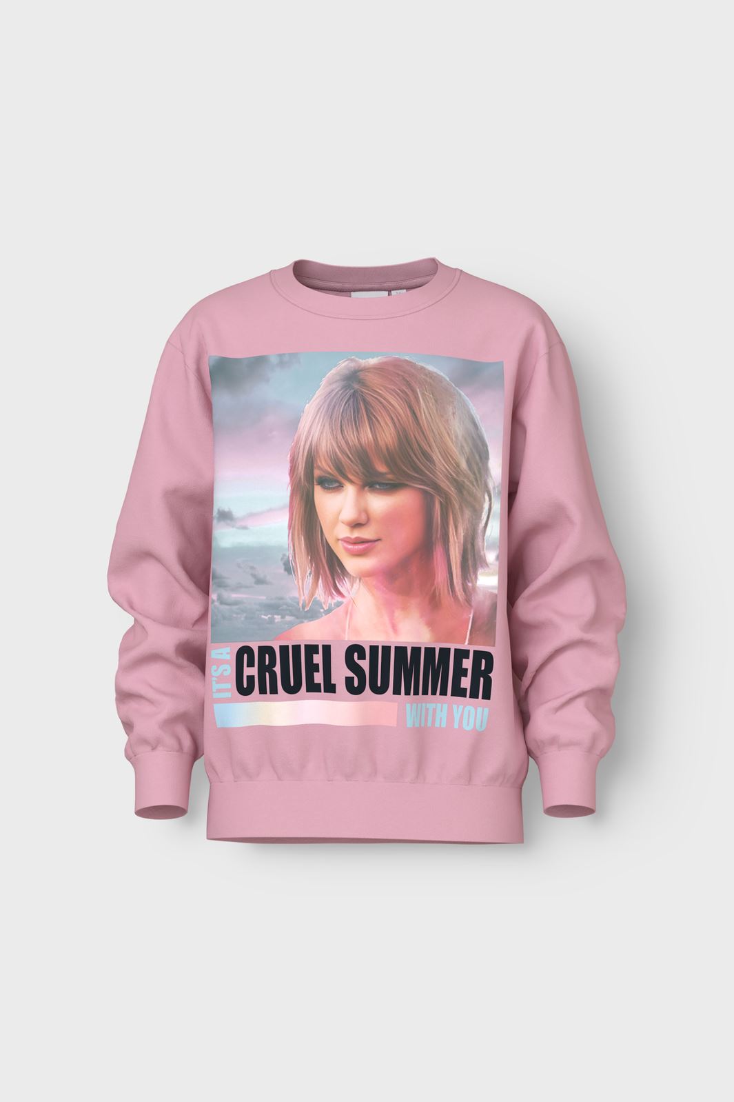 Rosa Sweatshirt von Name It mit einem großen Fotodruck auf der Vorderseite. Der Druck zeigt ein Porträt zusammen mit dem Text IT'S A CRUEL SUMMER WITH YOU in Schwarz und Hellblau.