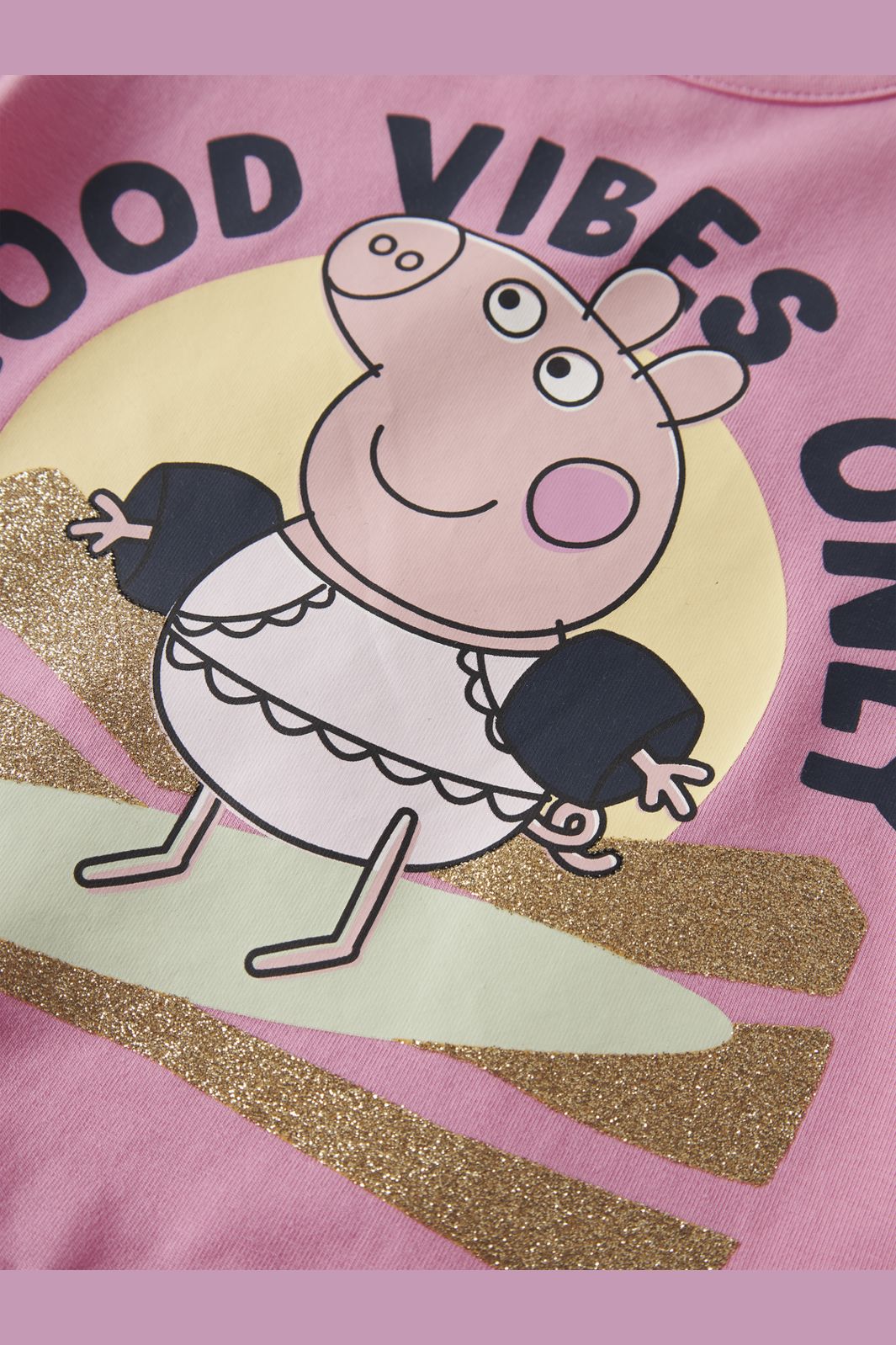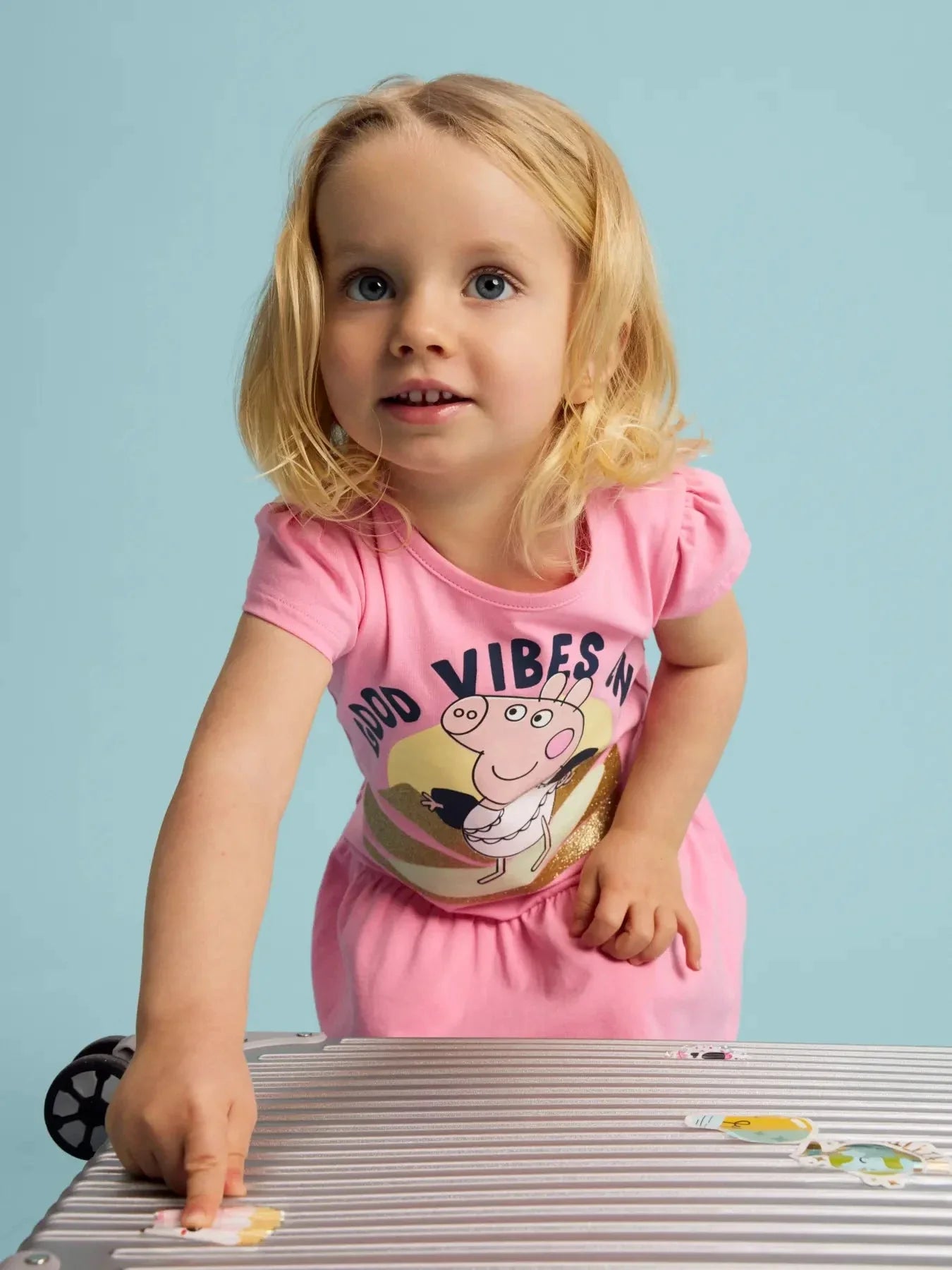 Kurzes Kleid von Name It in einer lebhaften pinken Farbe. Es hat einen großen Peppa Pig-Druck mit dem Text GOOD VIBES ONLY und glitzernden Goldelementen. Das Kleid hat einen gerafften Rock und einen runden Halsausschnitt.