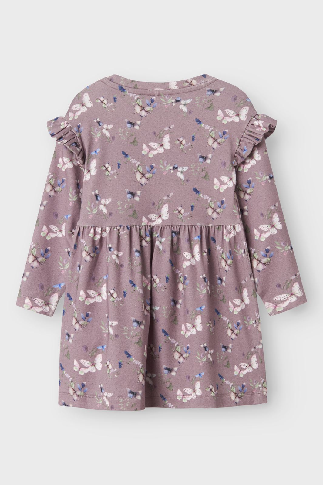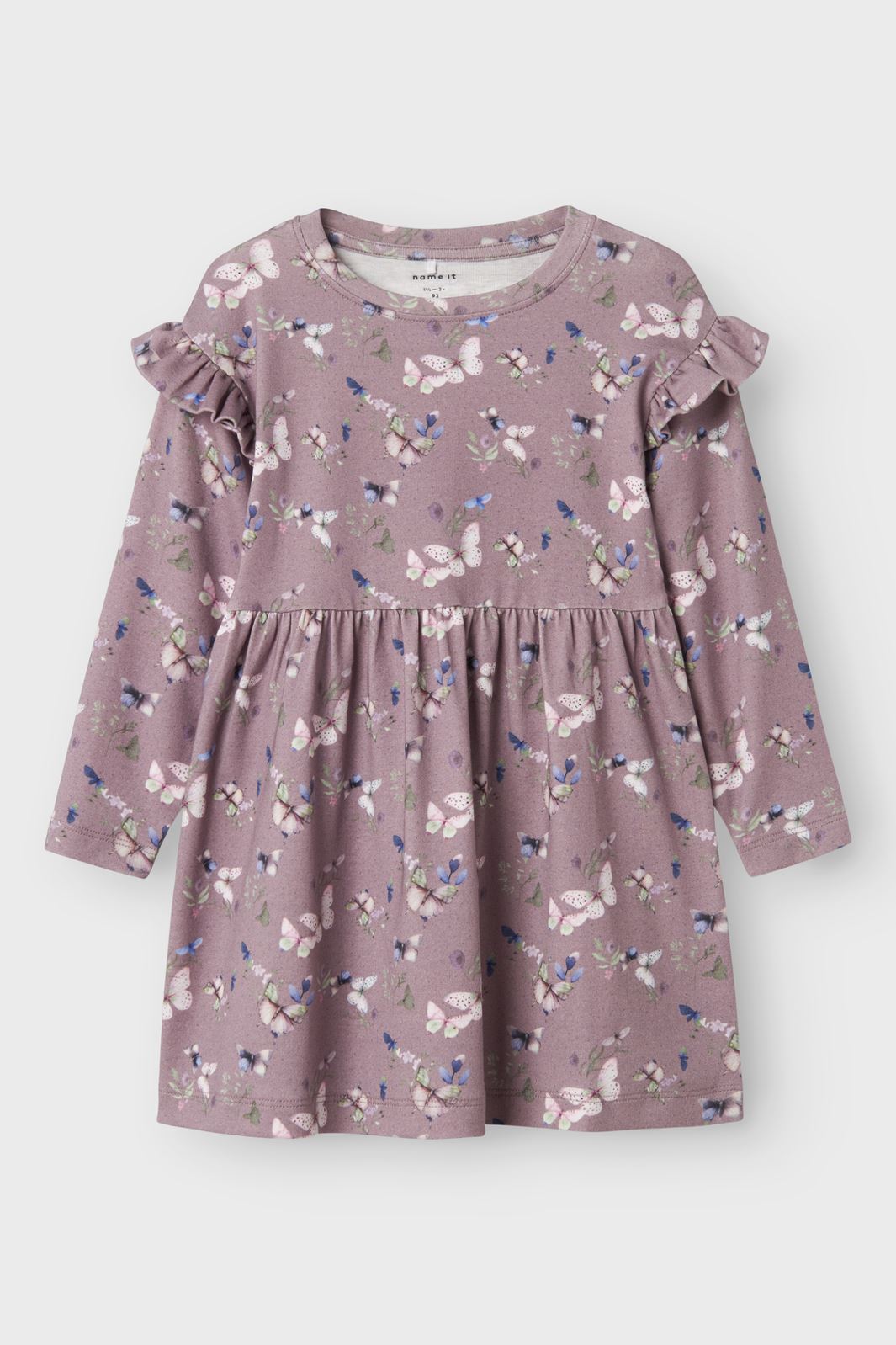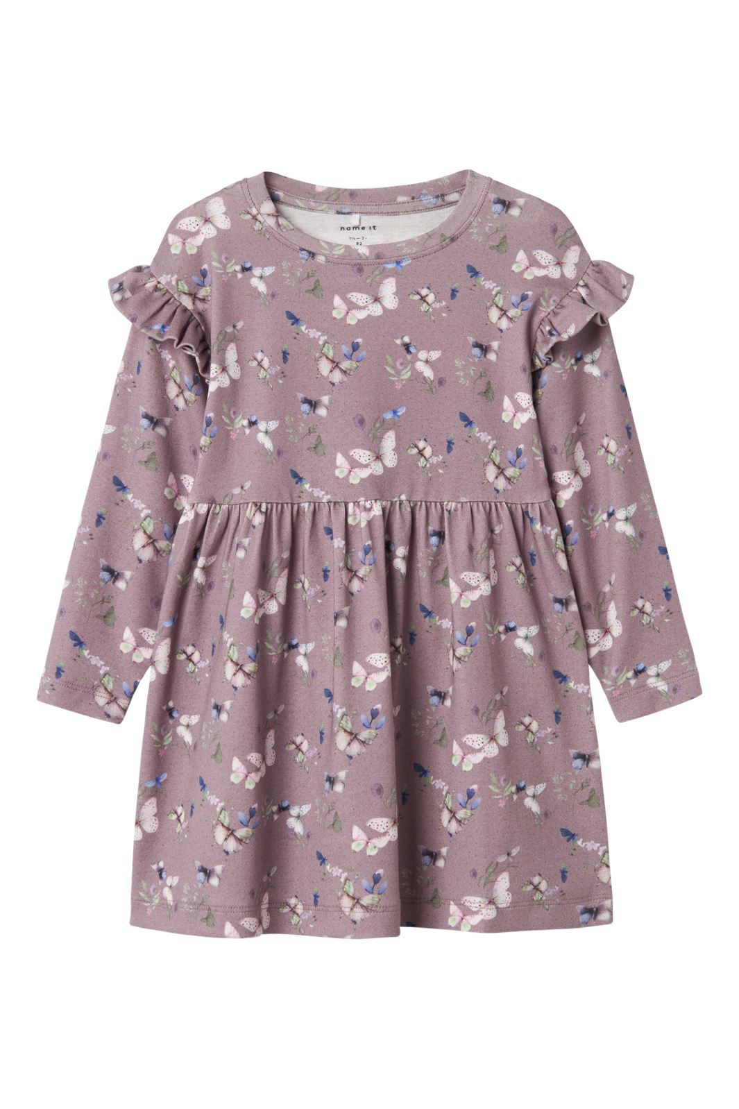 Lila Kleid mit Schmetterlings- und Blumenmuster von Name It. Das Kleid hat lange Ärmel, einen runden Ausschnitt und Rüschendetails an den Schultern. Die knielange Länge bietet gute Bewegungsfreiheit.