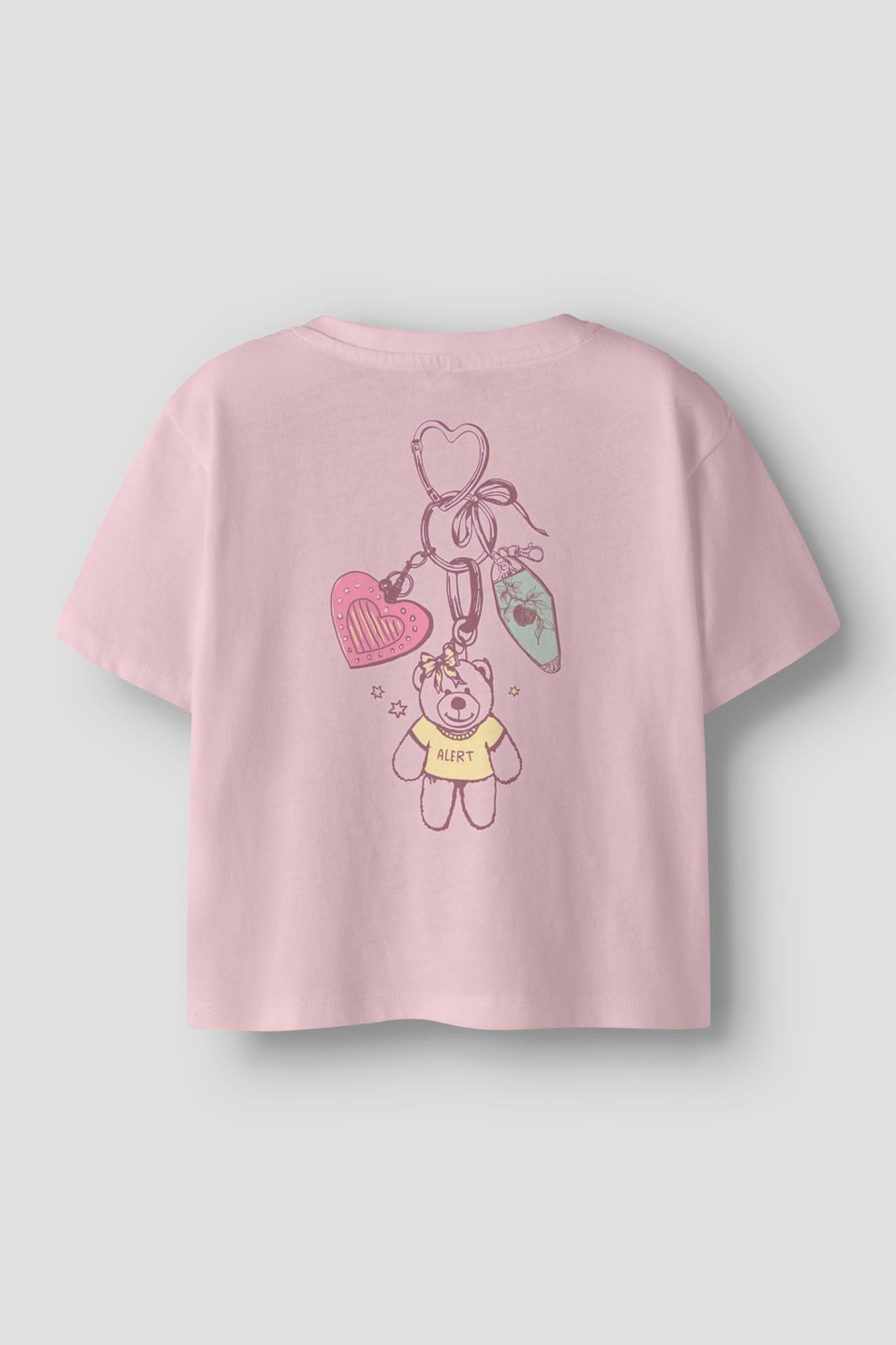 Rosa T-Shirt von Name It aus Bio-Baumwolle. Das T-Shirt hat ein Bärenmotiv mit dem Text ALERT auf der Vorderseite und ein größeres grafisches Design auf der Rückseite.