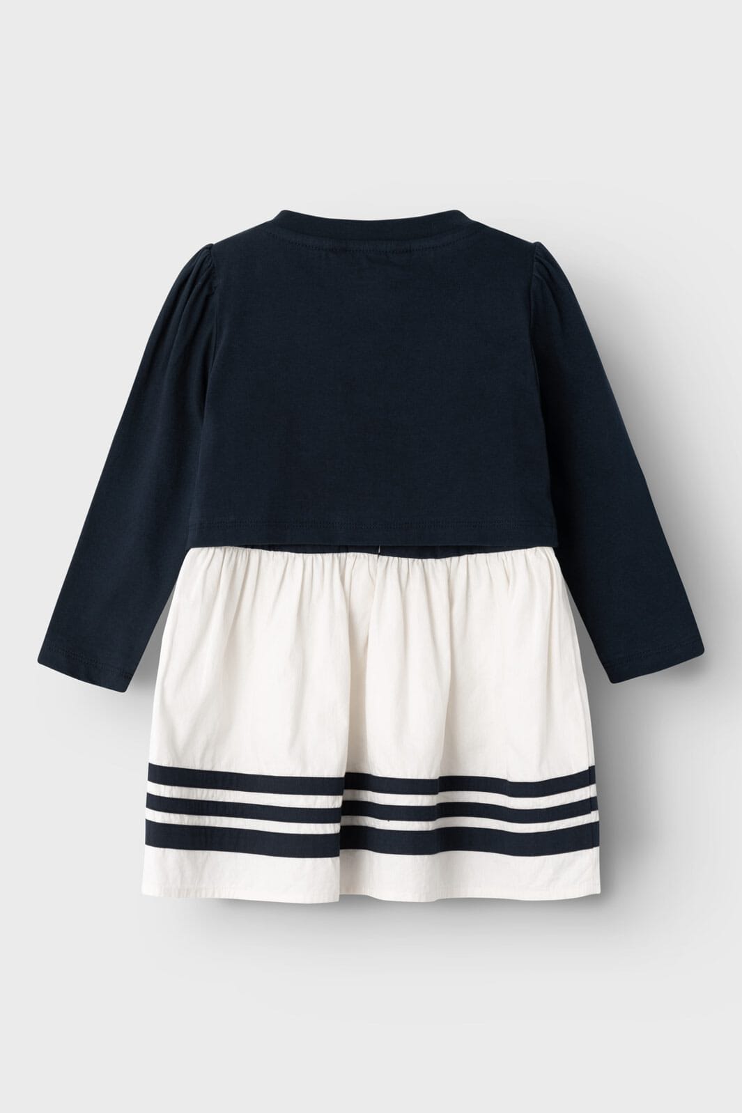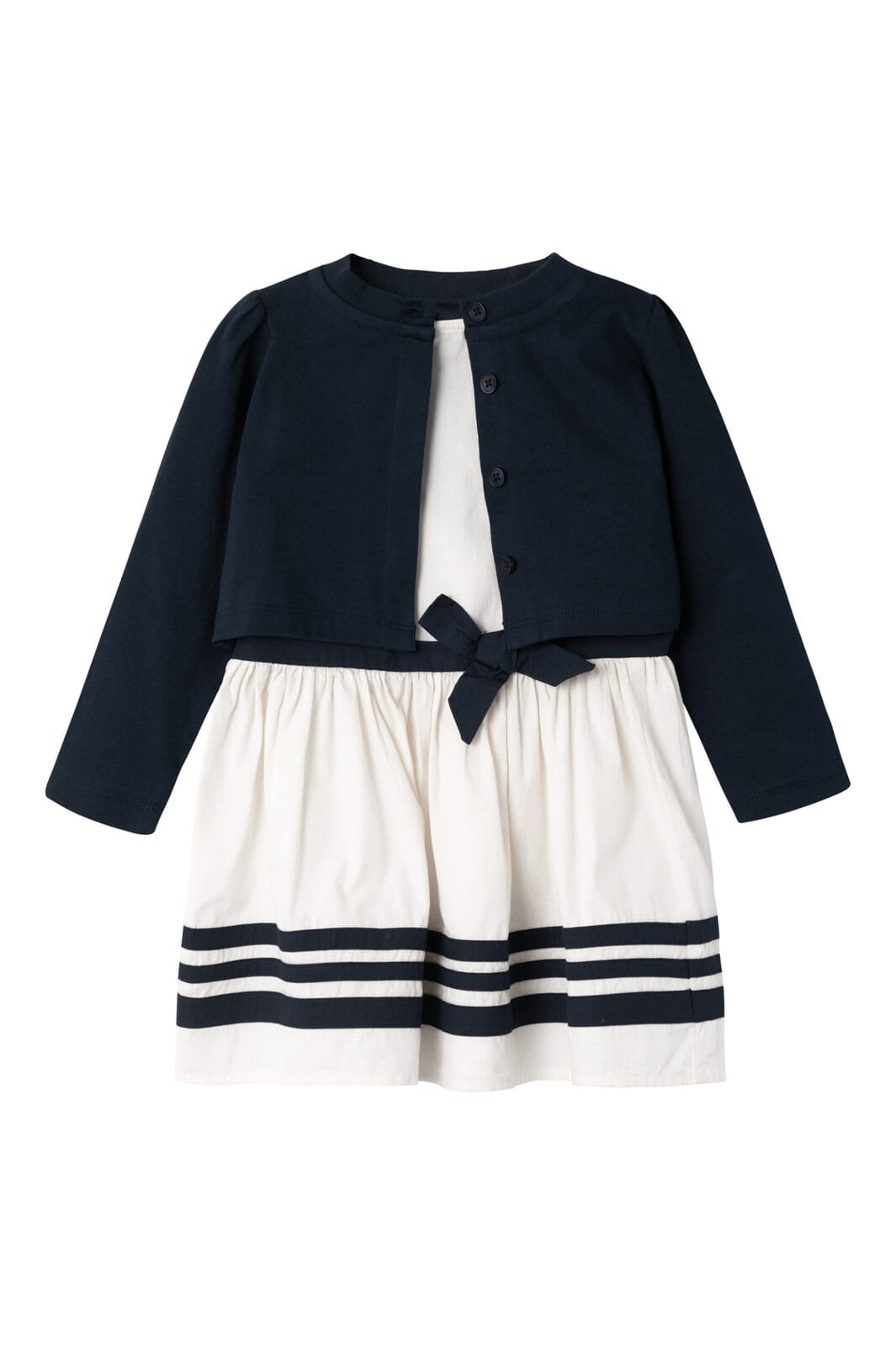 Set mit Kleid und Cardigan von Name It. Das Kleid hat einen runden Ausschnitt und ist ärmellos mit einem weißen Rock und marineblauen Streifen. Der passende Cardigan hat Knöpfe und ist marineblau.