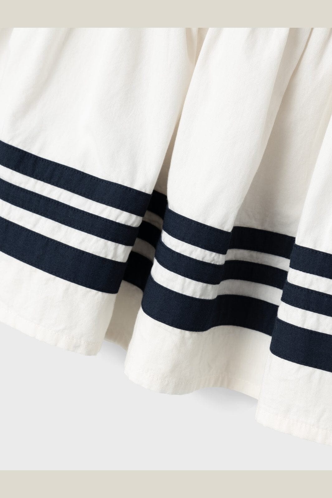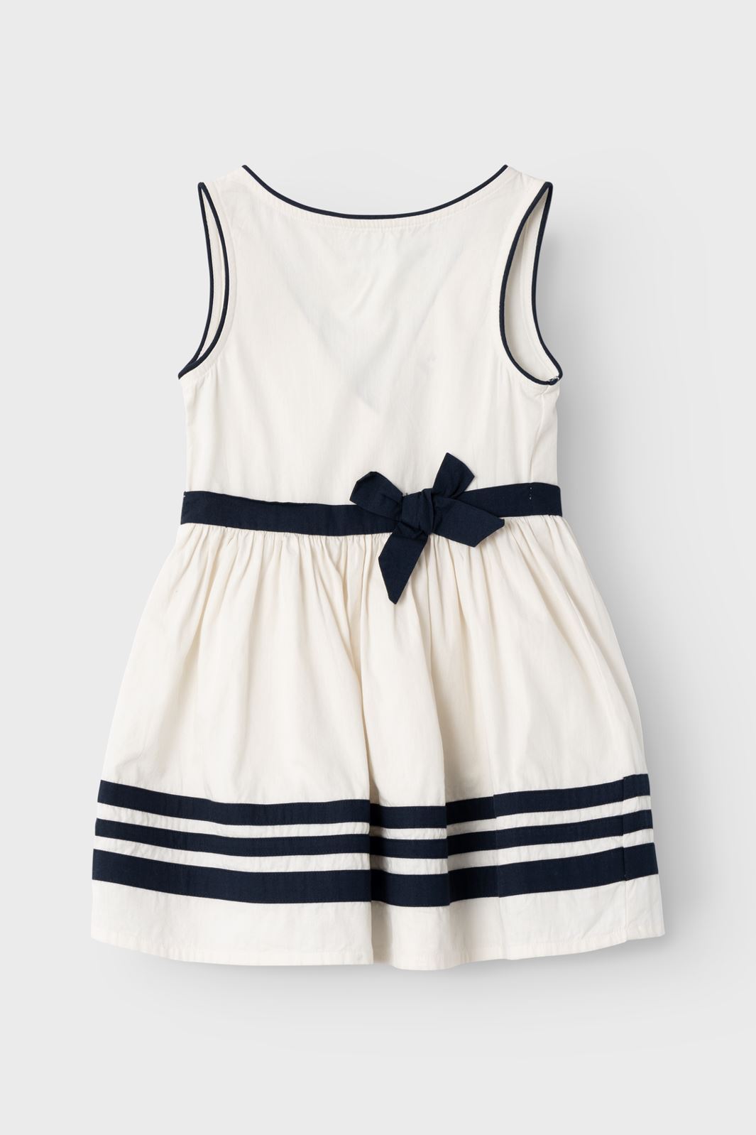 Das ärmellose Kleid hat eine Schleife in der Taille, die es einfach macht, die Passform anzupassen. Die marineblauen Streifen auf dem weißen Rock schaffen einen maritimen Ausdruck.