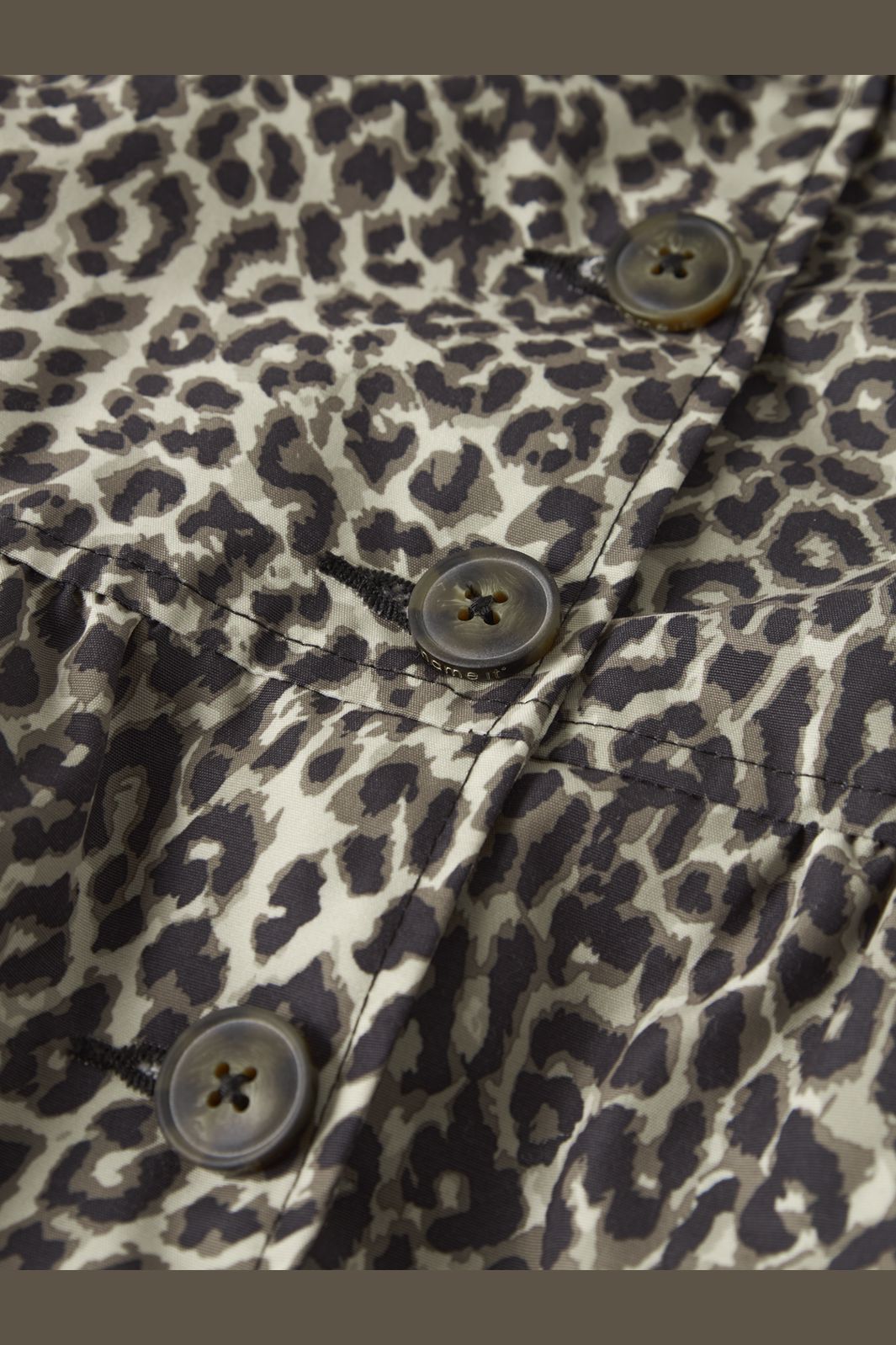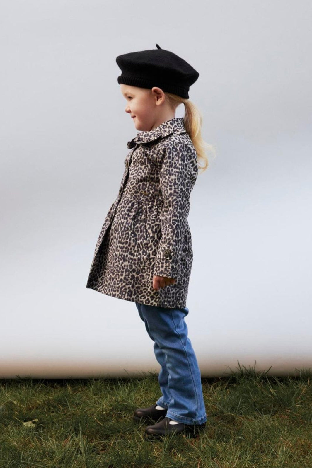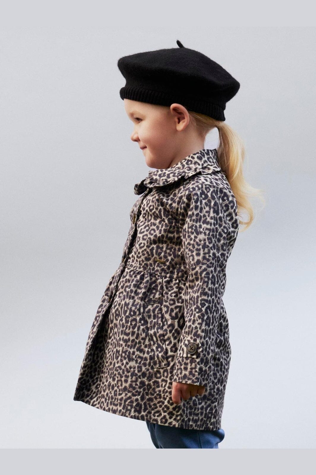 Trenchcoat von Name It mit durchgehendem Leopardenmuster. Der Mantel reicht bis zum Oberschenkel und hat einen ausgestellten Kragen, lange Ärmel und Seitentaschen.