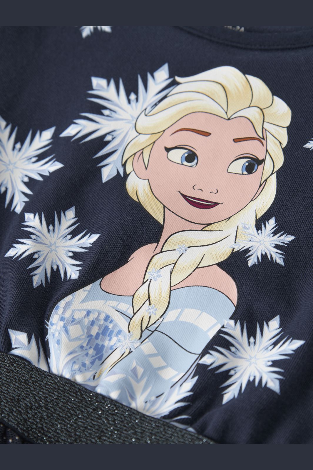 Dunkelblaues Kleid von Name It mit Tüllrock. Das Oberteil hat einen Schneeflocken-Print und der Rock glitzernde Pailletten sowie einen elastischen Bund.