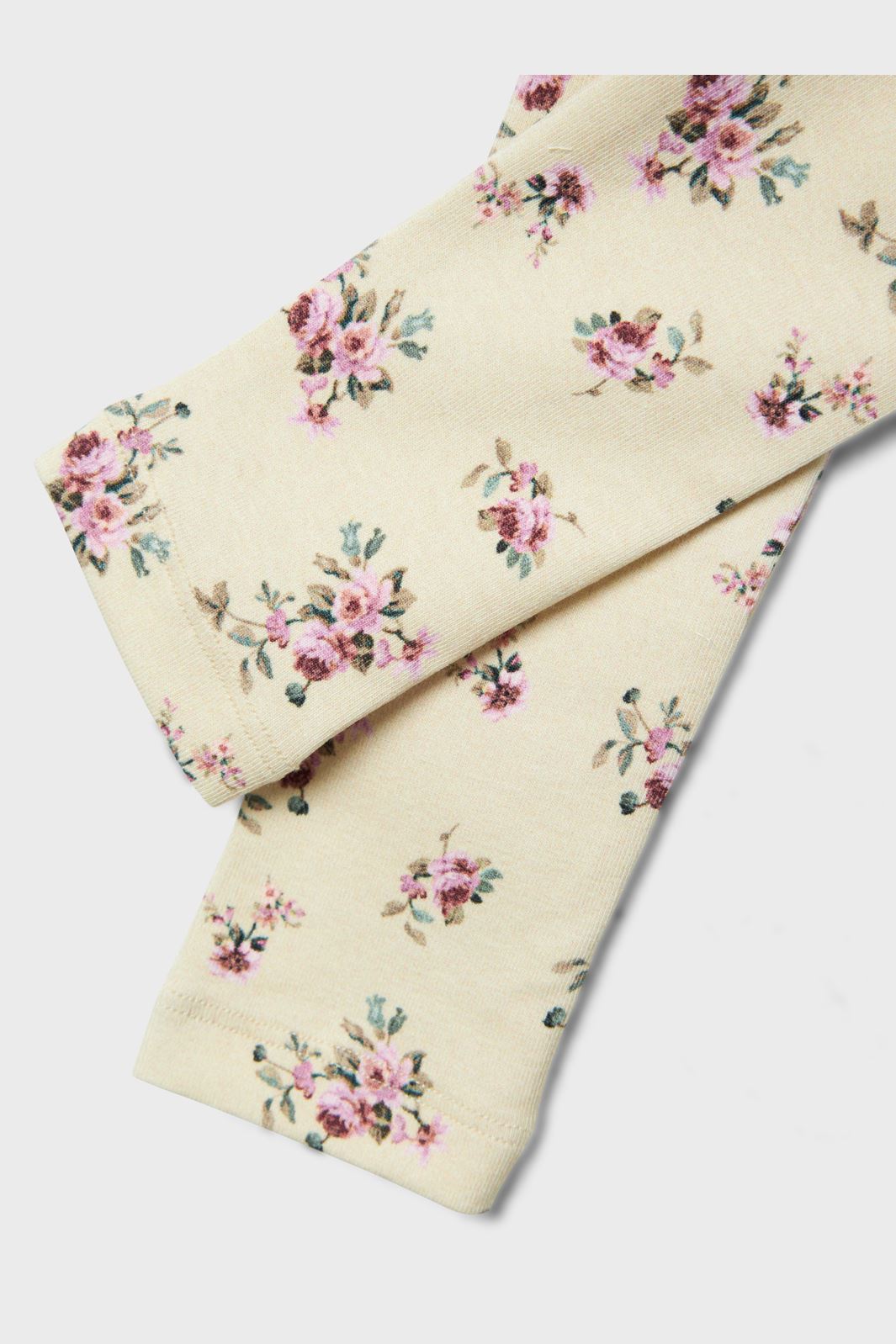Beige Leggings von Name It mit rosa und grünen Blumen. Das feine Blumenmuster bedeckt den gesamten Stoff und verleiht den Leggings einen leichten und verspielten Ausdruck.