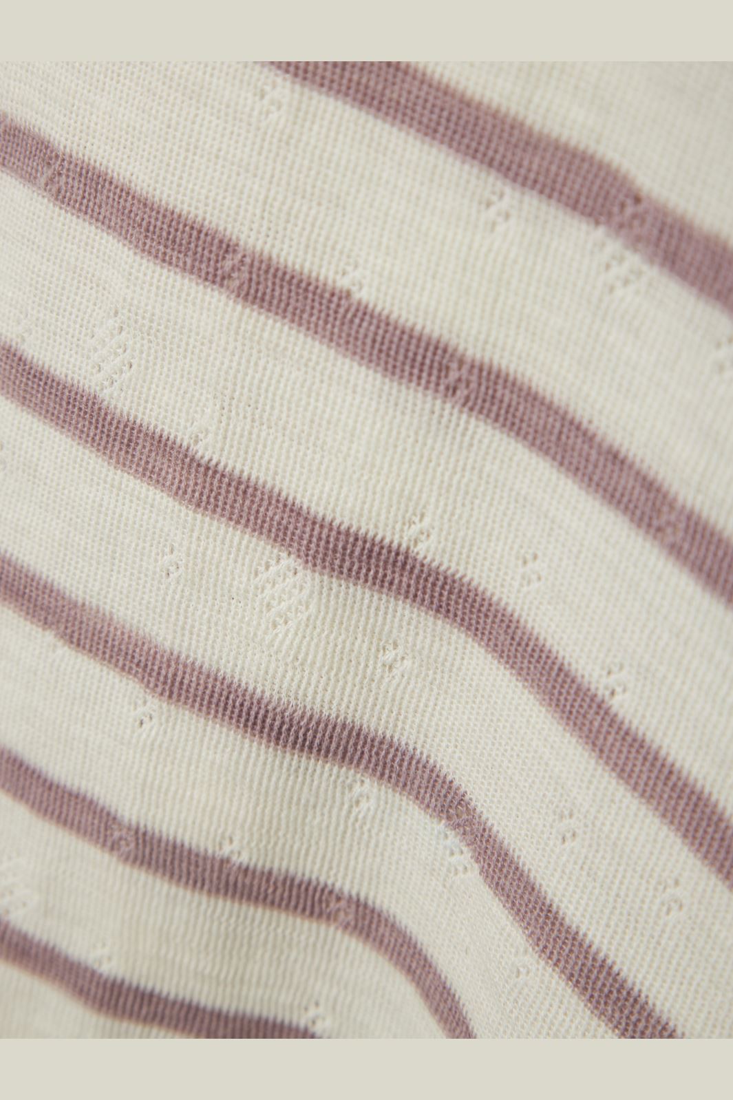 Ein langärmliges Oberteil aus Merinowolle mit Streifen in Schneeweiß und Lila. In Needle Drop-Technik gestrickt mit Lochmuster und Spitzen-Details am Hals und an den Ärmeln.