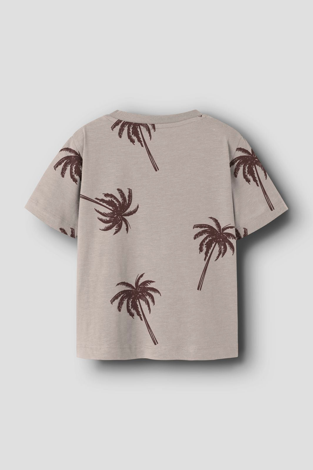 Graues T-Shirt von Name It mit braunen Palmen. Das T-Shirt hat einen runden Halsausschnitt und kurze Ärmel.