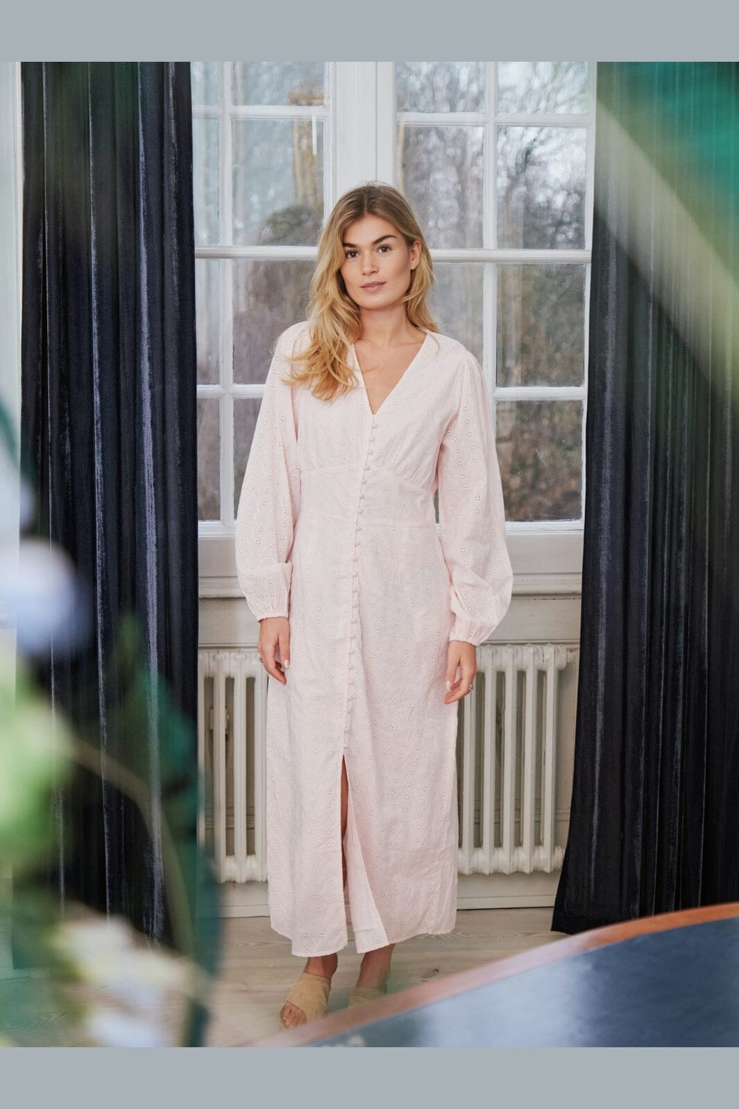Rosa Kleid von Neo Noir aus 100 % Baumwolle in Broderie-Anglaise-Qualität. Das Kleid hat ein durchgehendes Stickmuster mit V-Ausschnitt.