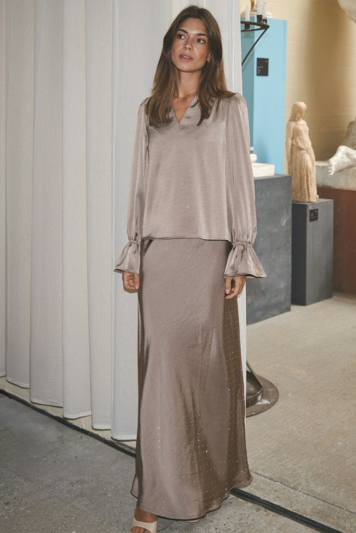 Braune Satinbluse von Neo Noir mit gepunktetem Muster und Pailletten. Die Bluse hat einen V-Ausschnitt mit gerafften Details und lange Ärmel mit Rüschen an den Manschetten.