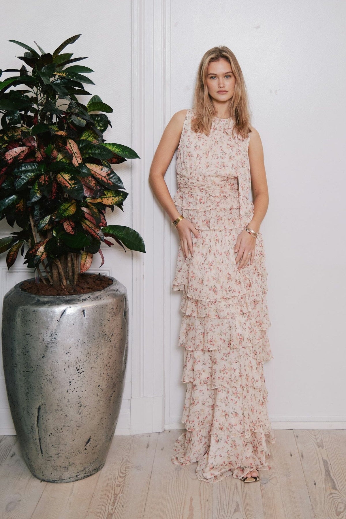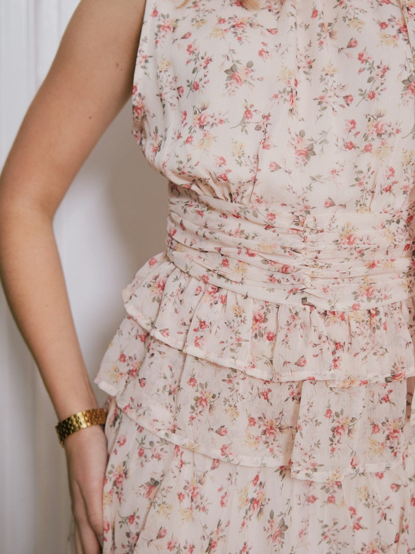 Ärmlose Top von Neo Noir mit Blumenprint in rosa und grünen Nuancen auf cremefarbenem Hintergrund. Das Top hat einen hohen Ausschnitt und eine schmale Passform.