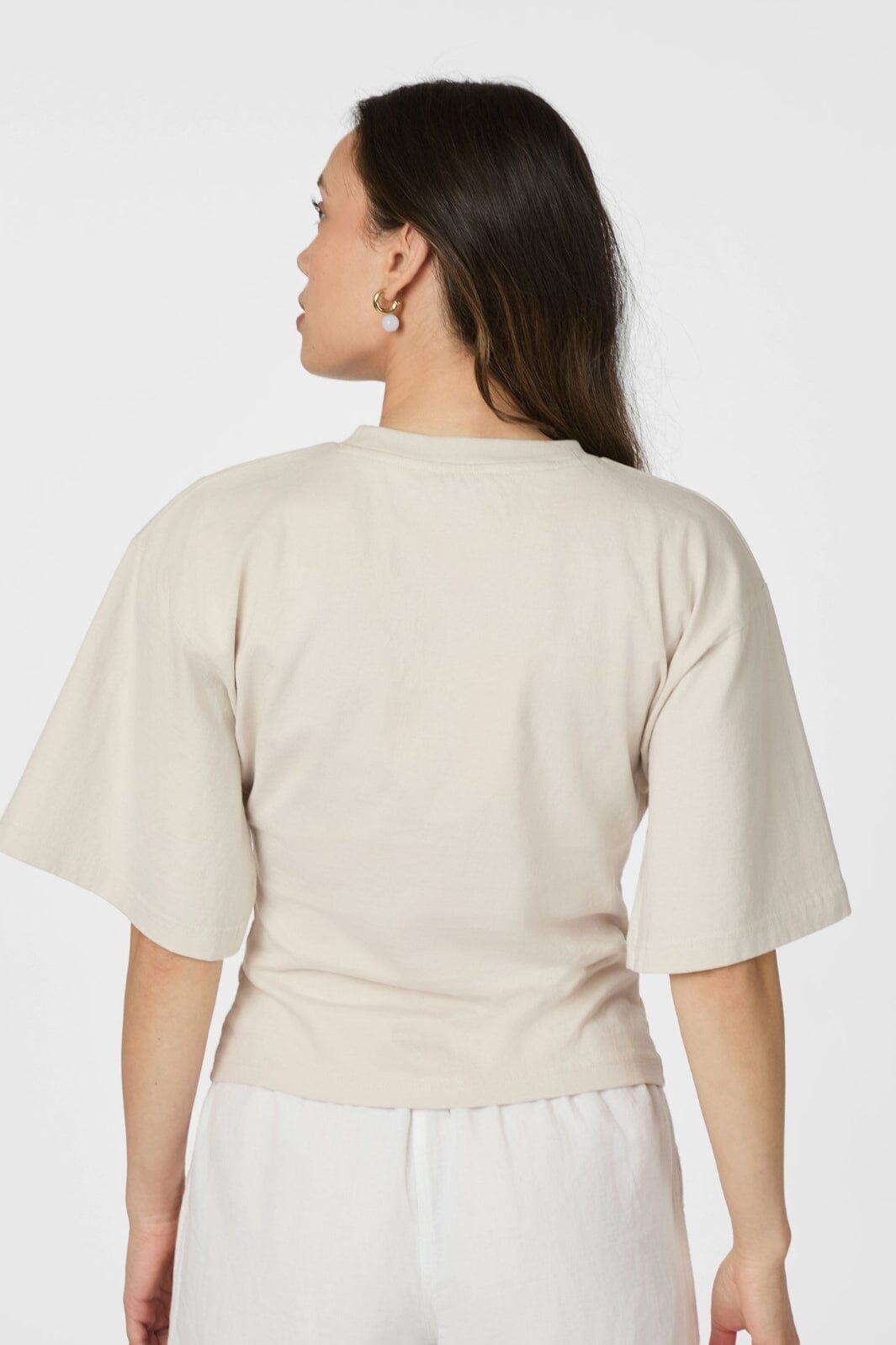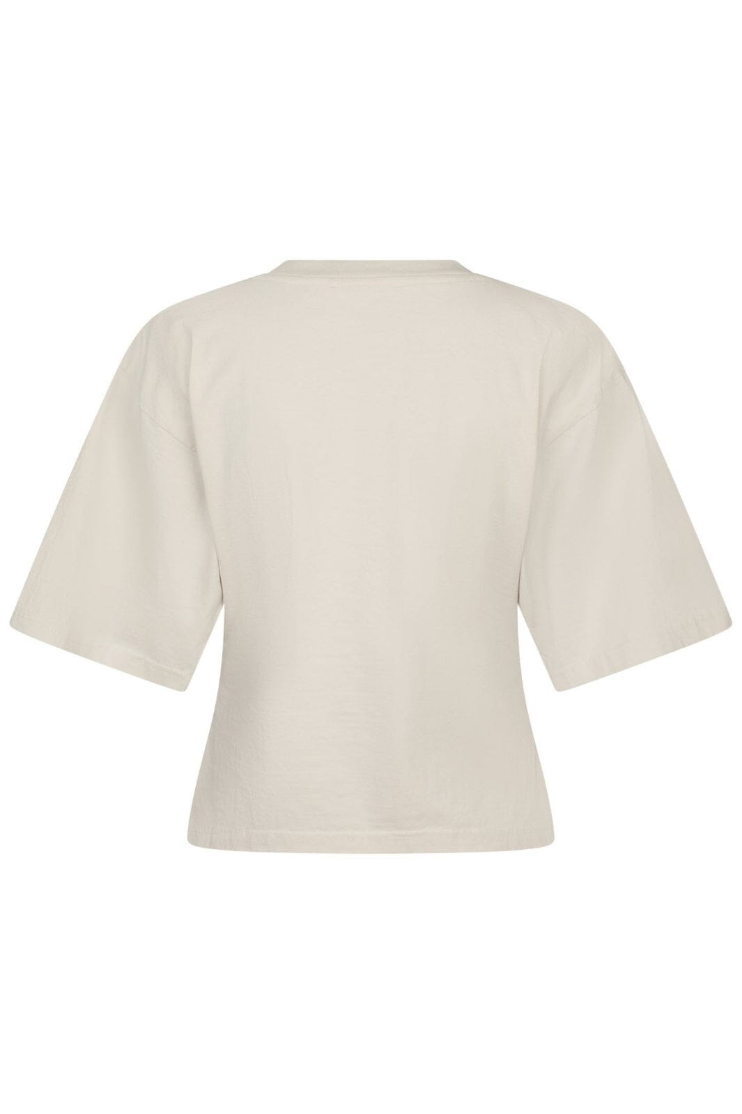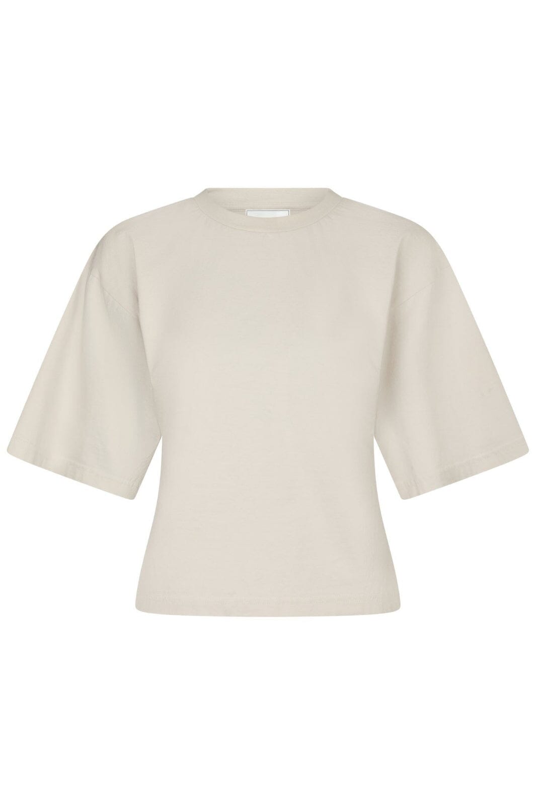 T-Shirt von Neo Noir in einem hellen Beige. Sie hat eine boxy Passform an den Schultern und kurze Ärmel mit einem runden Ausschnitt.