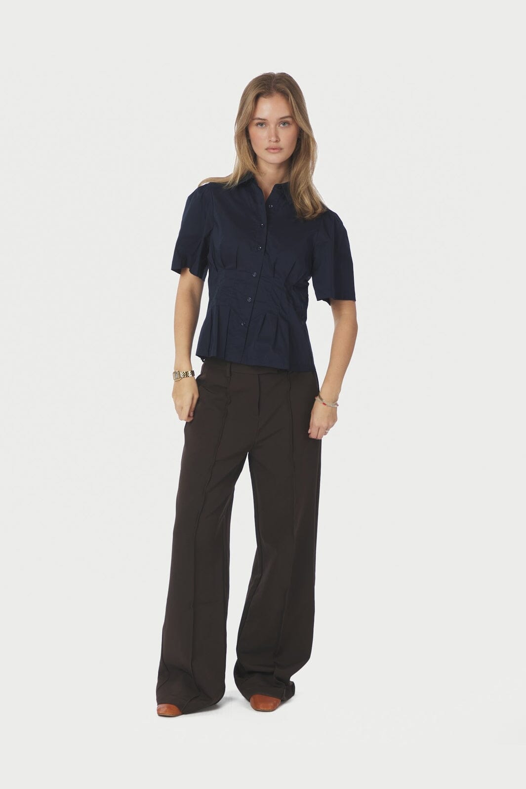 Dunkelblaues Hemd von Neo Noir aus Popeline-Qualität. Das Hemd hat kurze Ärmel, eine Knopfleiste vorne und einen Hemdkragen mit dekorativen Nähten und Falten.