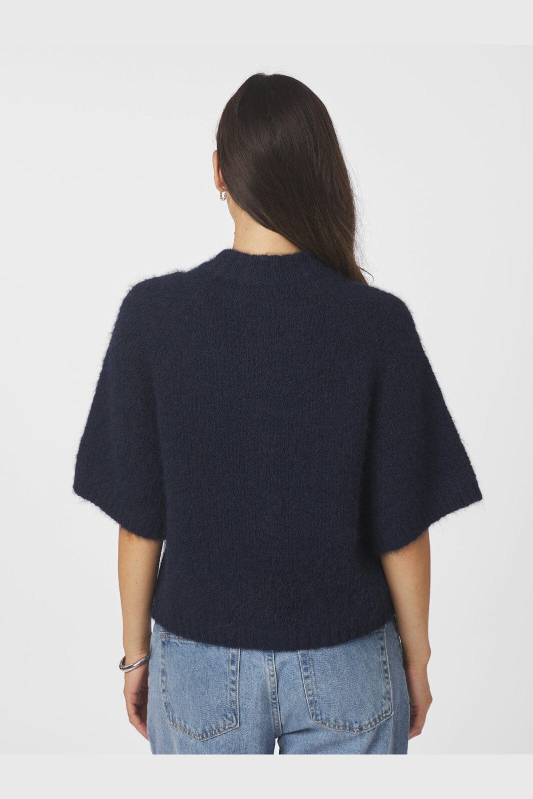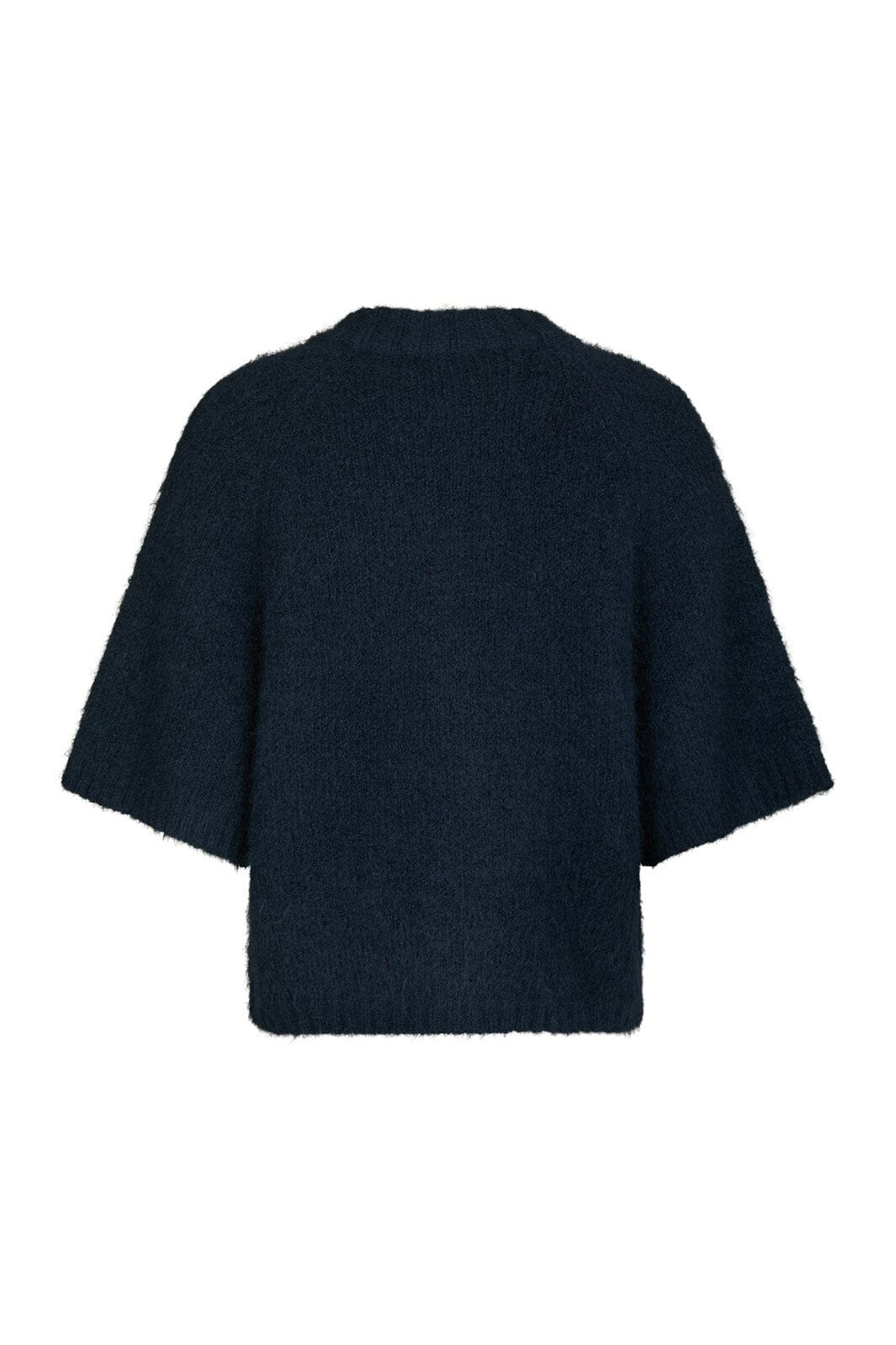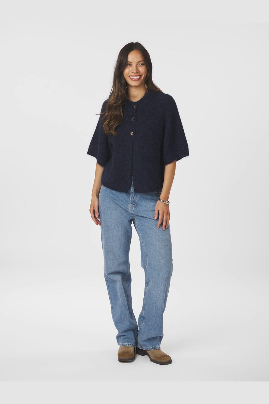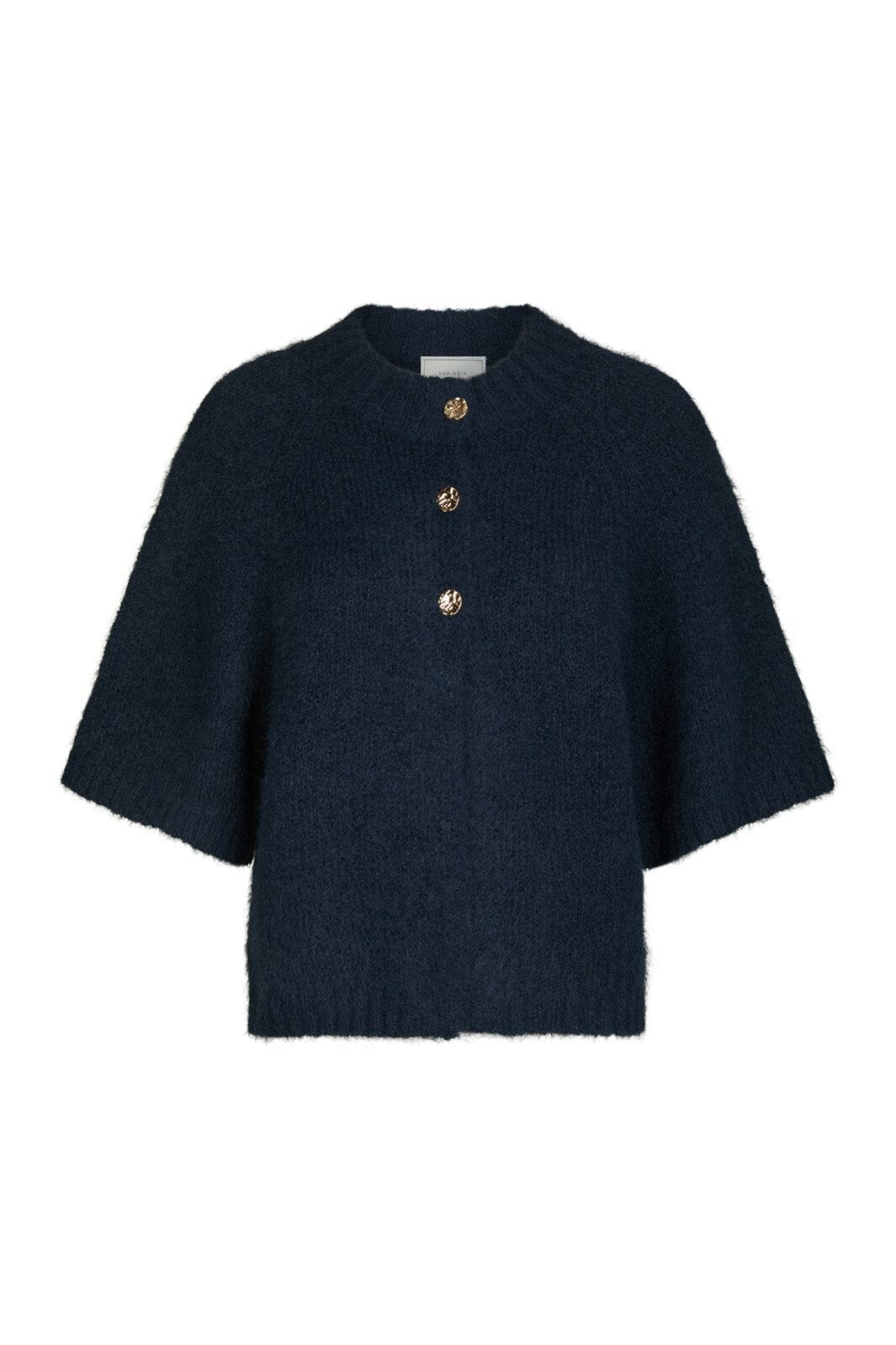 Dunkelblaue Strickjacke von Neo Noir in einer weichen, flauschigen Strickqualität. Sie hat kurze Ärmel und eine lockere, kastige Passform mit drei dekorativen Knöpfen vorne.