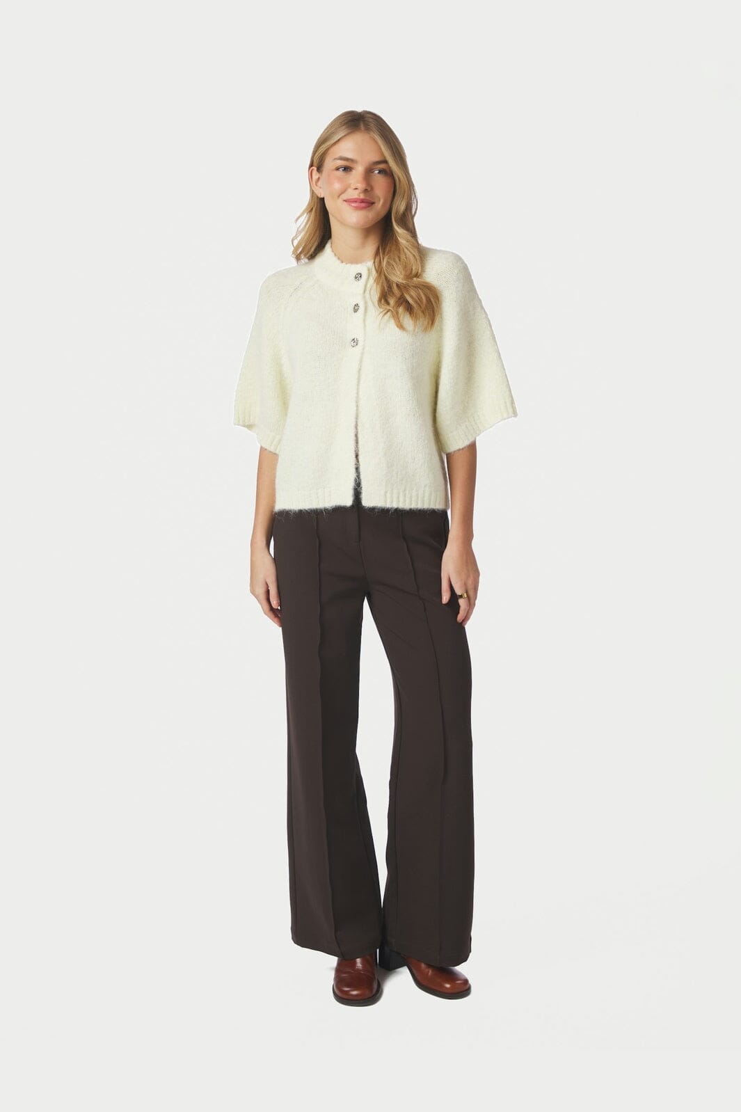 Hellgelbe Strickcardigan von Neo Noir in einer weichen, flauschigen Qualität. Die Cardigan hat eine lockere Passform mit weiten 3/4-Ärmeln und Knöpfen vorne.