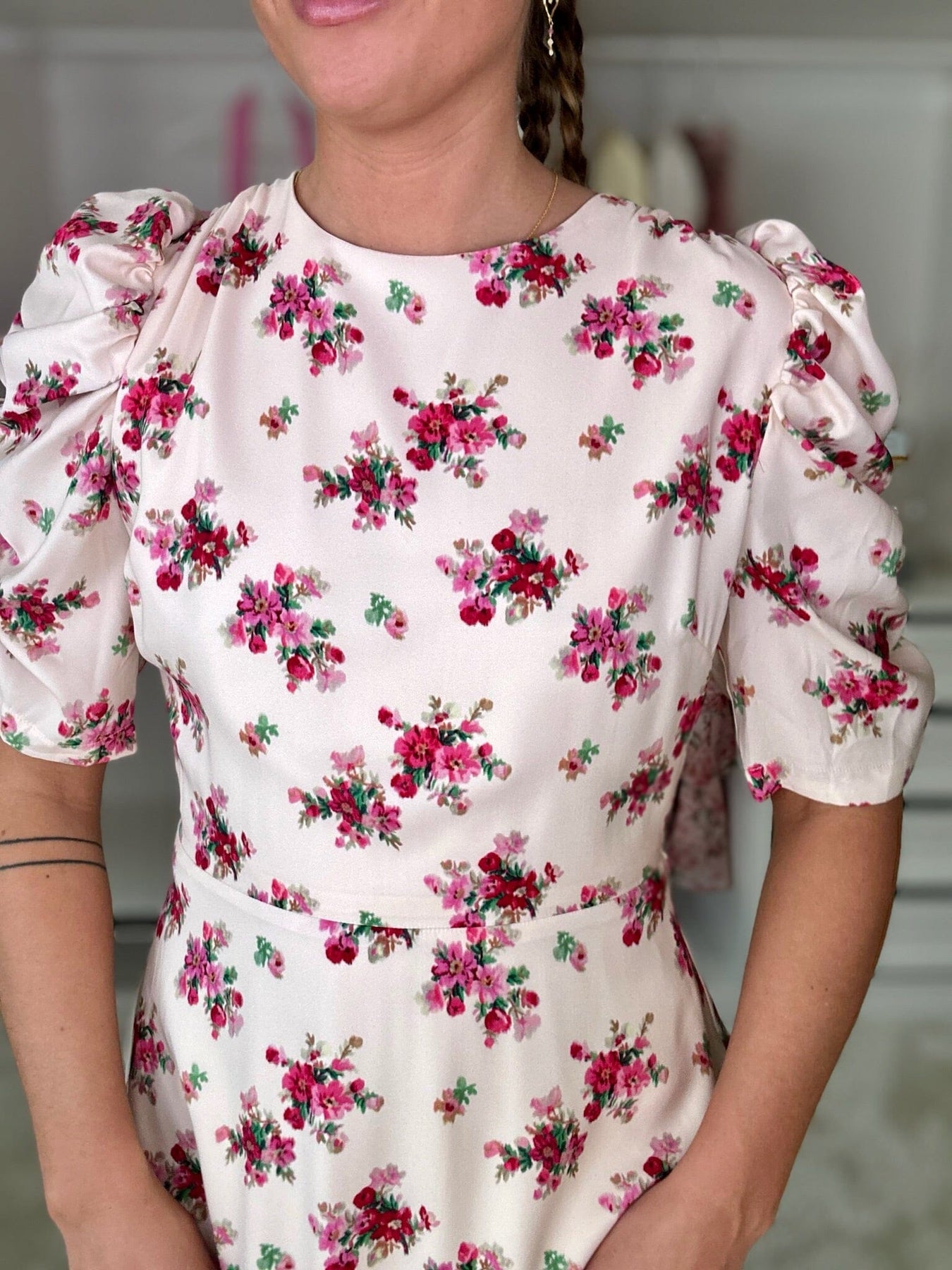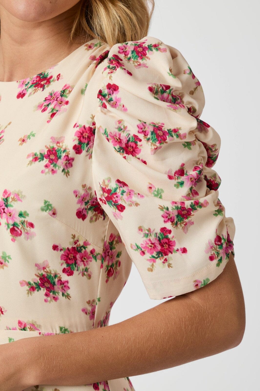 Rosa knöchellanges Kleid von Neo Noir mit Blumenmuster in Pink und Grün. Das Kleid hat kurze Ärmel mit Rüschendetails und einen runden Ausschnitt.