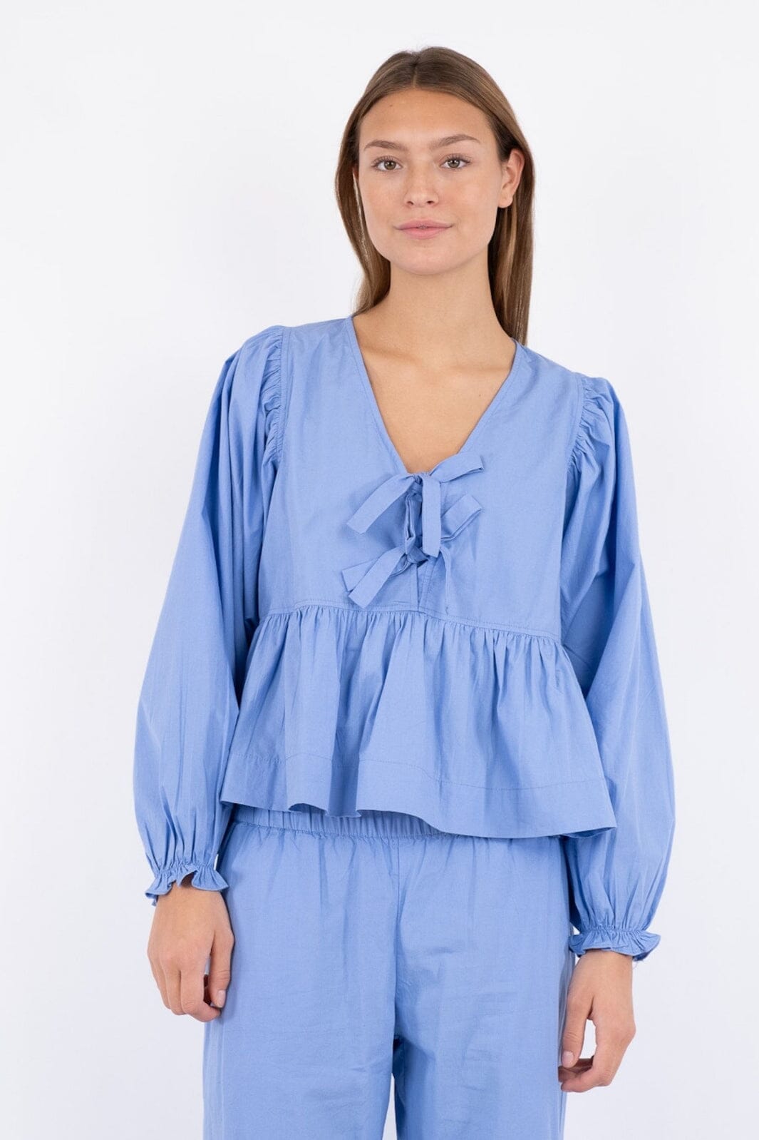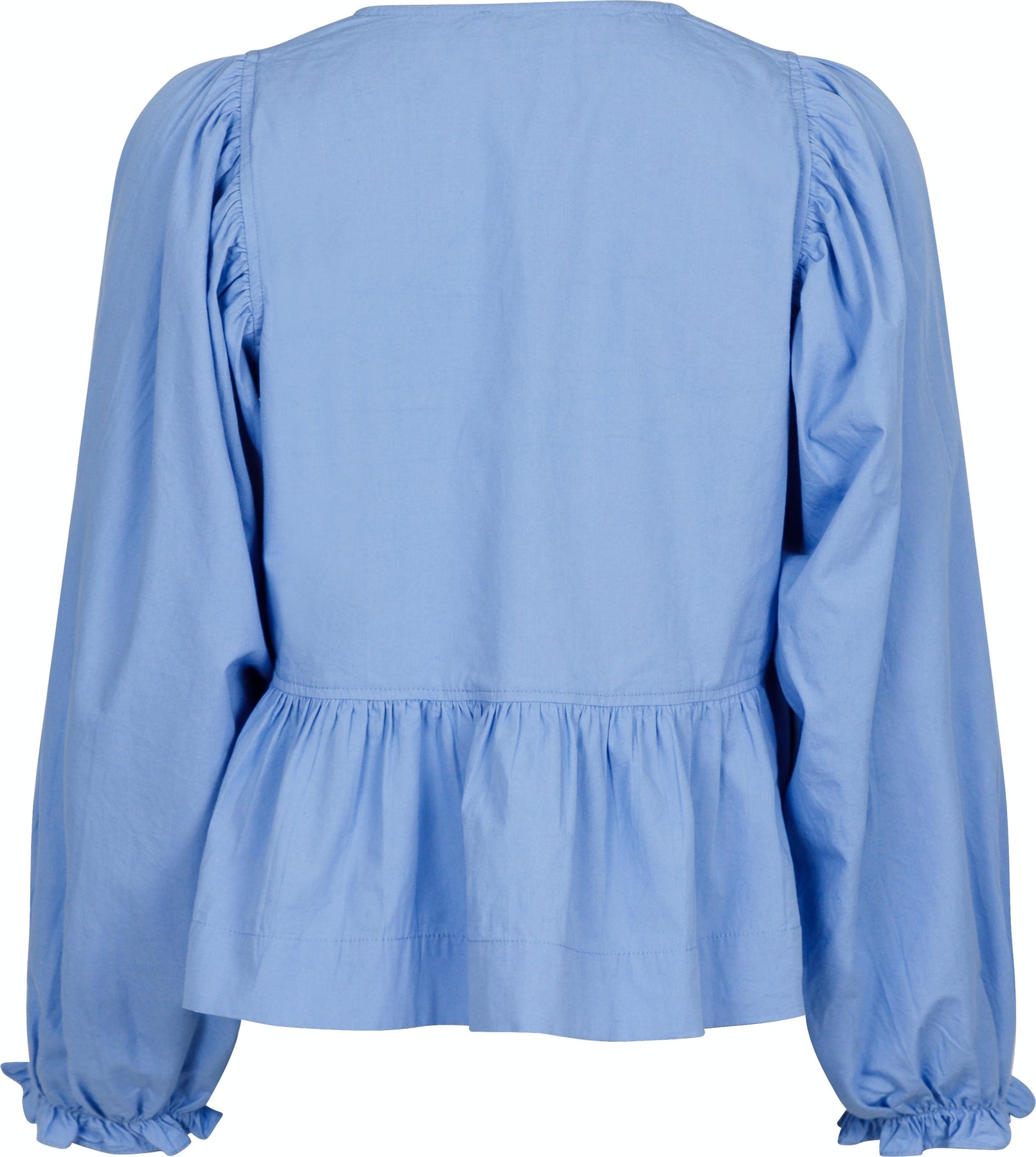 Himmelblaue Popeline-Bluse von Neo Noir mit Puffärmeln und V-Ausschnitt. Die Bluse hat Rüschendetails am Saum und zwei Bindebänder vorne, die nach Wunsch angepasst werden können.