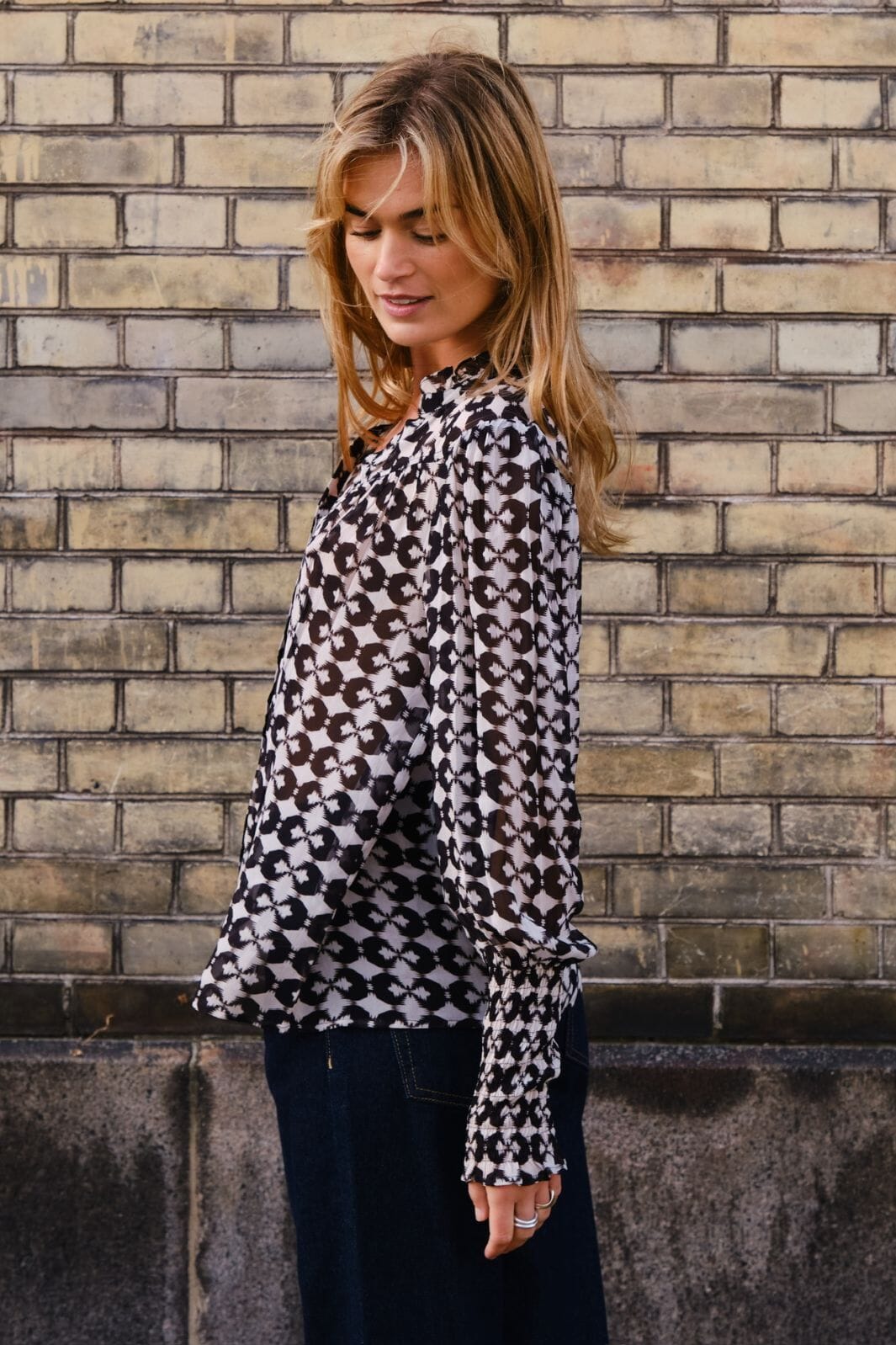 Schwarze Bluse von Neo Noir mit grafischem schwarz-weißem Muster. Eine Bluse mit V-Ausschnitt und langen Ärmeln, die sowohl mit Jeans als auch mit einem Rock gestylt werden kann.
