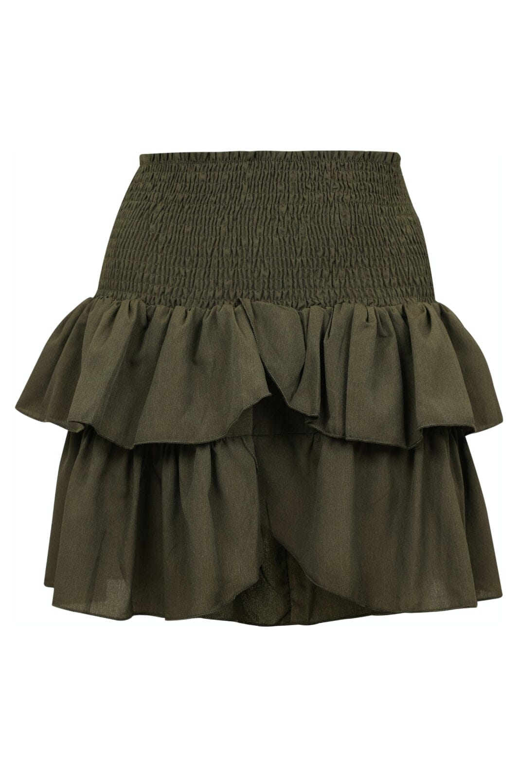 Rock von Neo Noir in Olivgrün. Hergestellt aus recyceltem Polyester mit Smock-Taille und zwei Lagen Volants. Die hohe Taille und die weichen Falten schaffen eine schöne Silhouette.