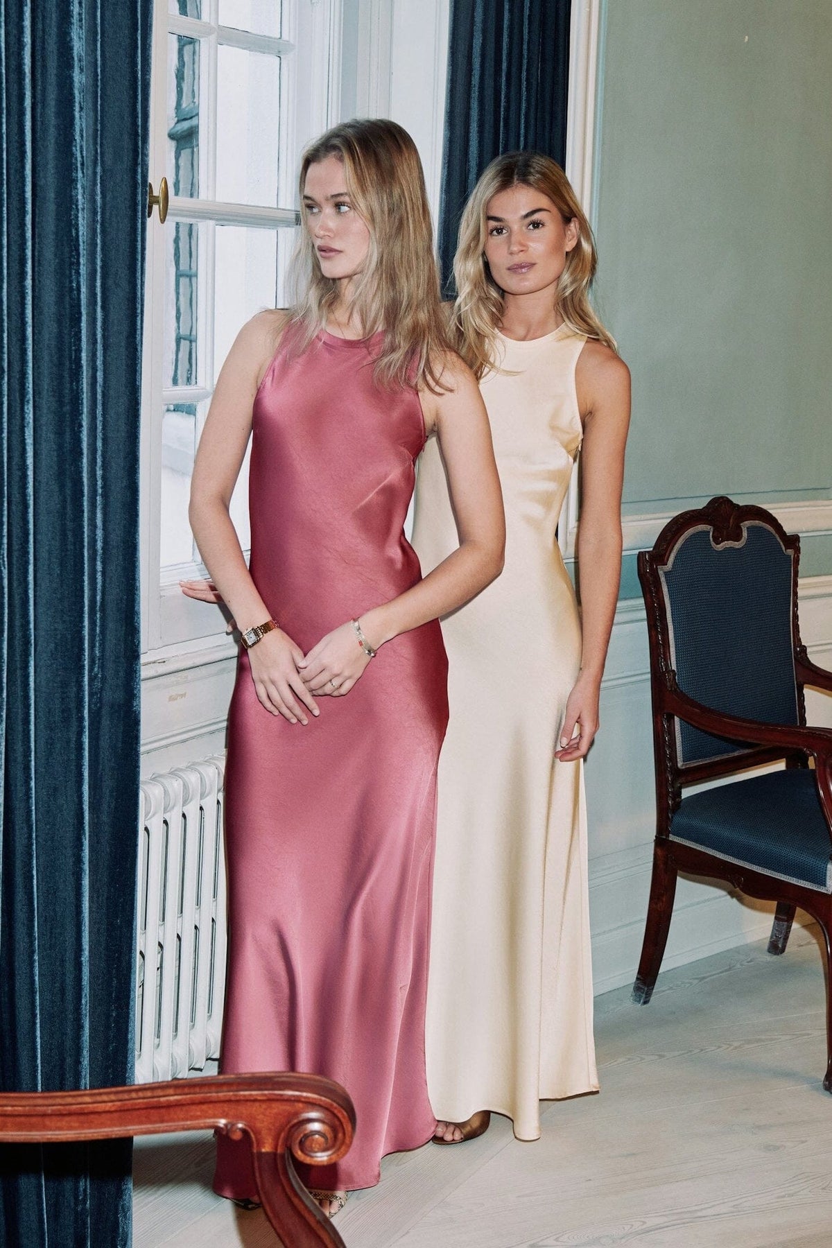 Langes rosa Kleid von Neo Noir aus schwerem Satin. Das Kleid hat eine schmale Passform und ist ärmellos mit rundem Halsausschnitt.