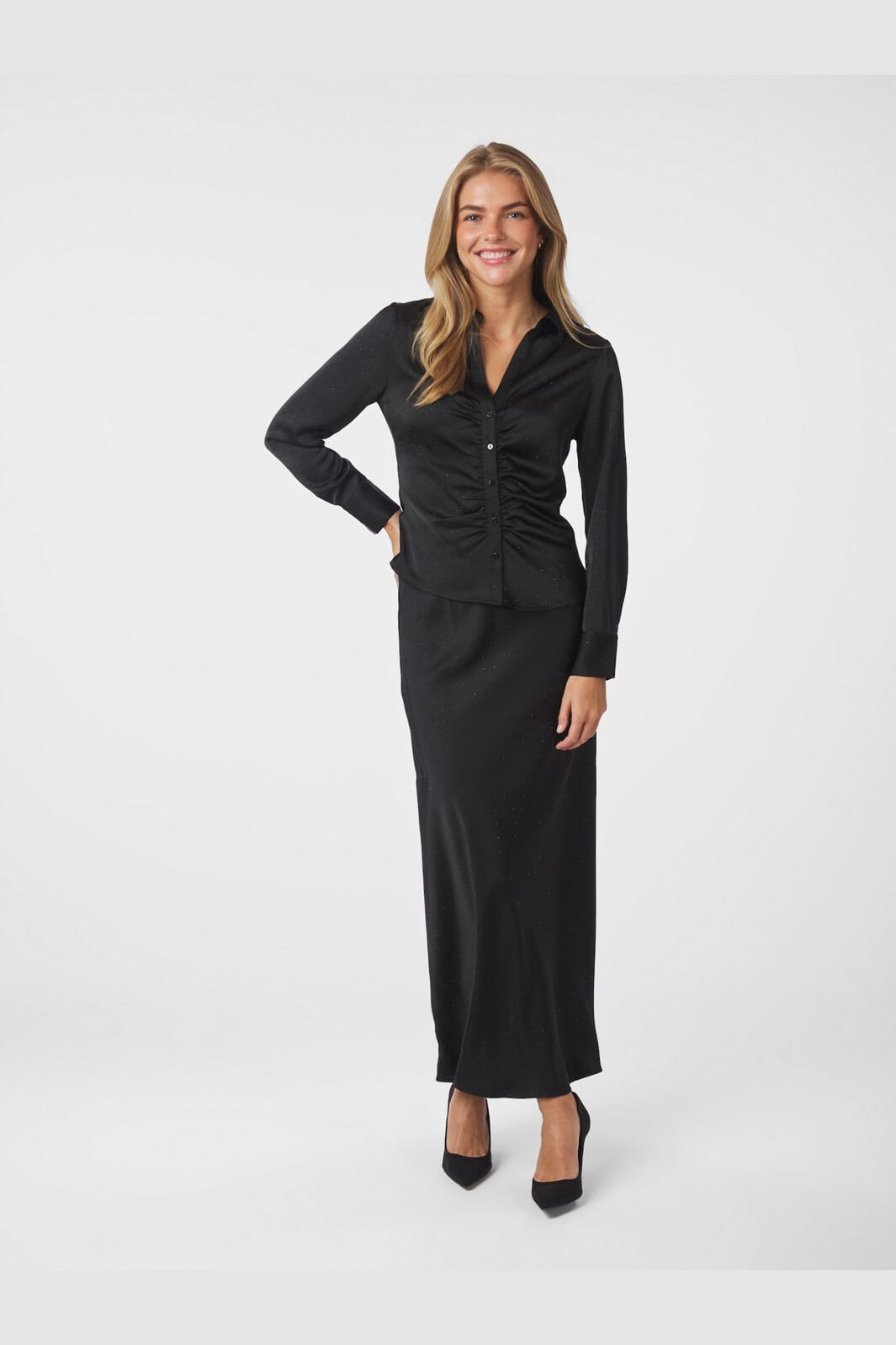 Schwarzes Hemd von Neo Noir aus Satin mit Pailletten. Das Hemd hat eine geraffte Vorderseite, einen Hemdkragen und eine Knopfleiste. Der schlanke Schnitt und der glänzende Stoff verleihen einen festlichen Look.