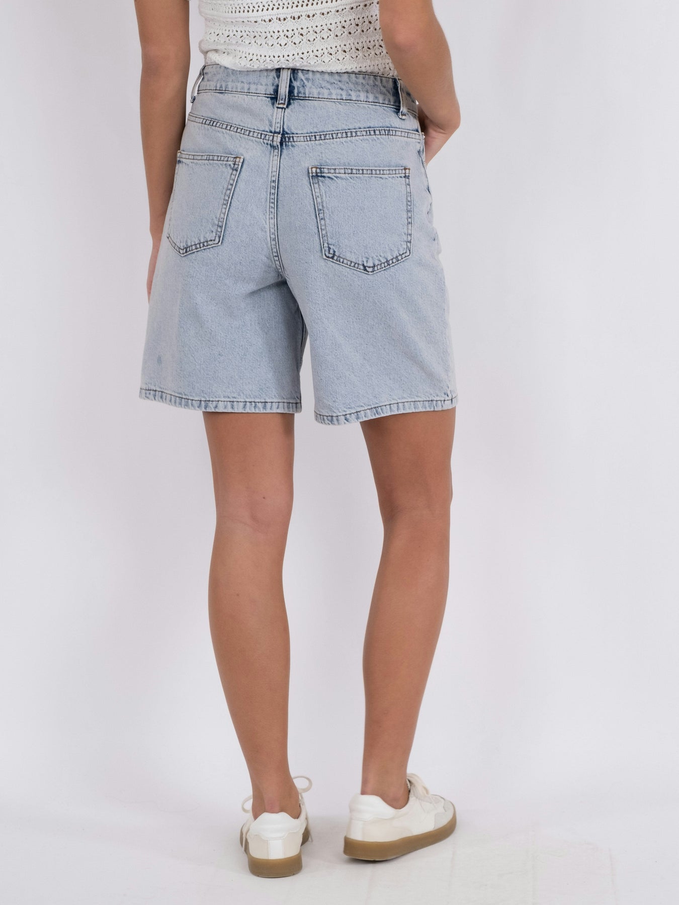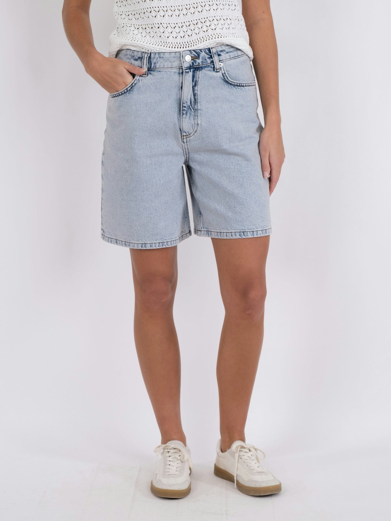Shorts von Neo Noir in einem hellblauen Farbton. Sie haben eine hohe Taille und reichen bis zum Oberschenkel. Hergestellt aus Baumwolle mit Reißverschluss und Knöpfen als Verschluss.
