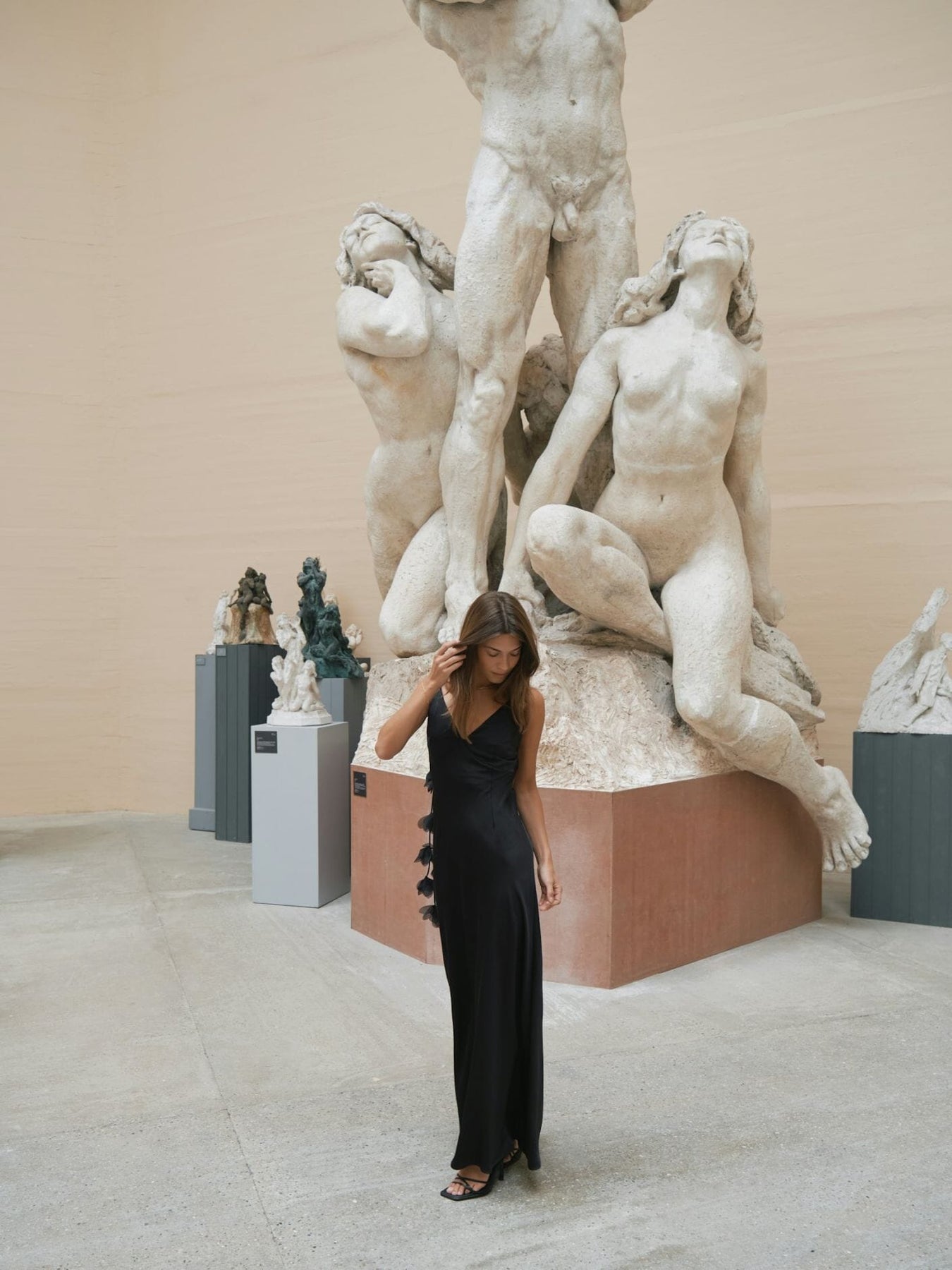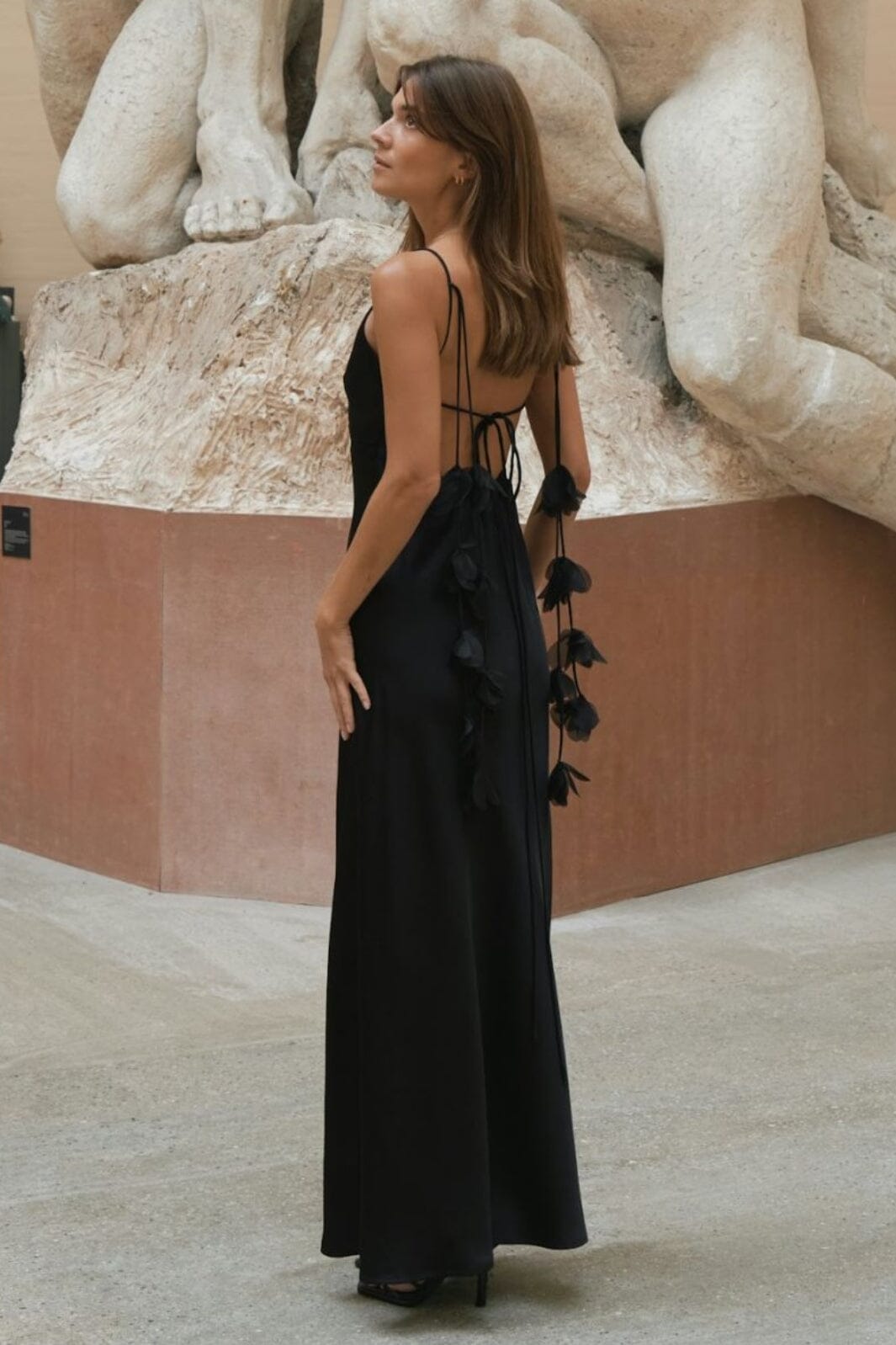 Schwarzes, bodenlanges Kleid von Neo Noir aus schwerem Crêpe-Satin. Das Kleid hat einen V-Ausschnitt, Spaghettiträger mit Blumendetails und ein Bindeband am Rücken.