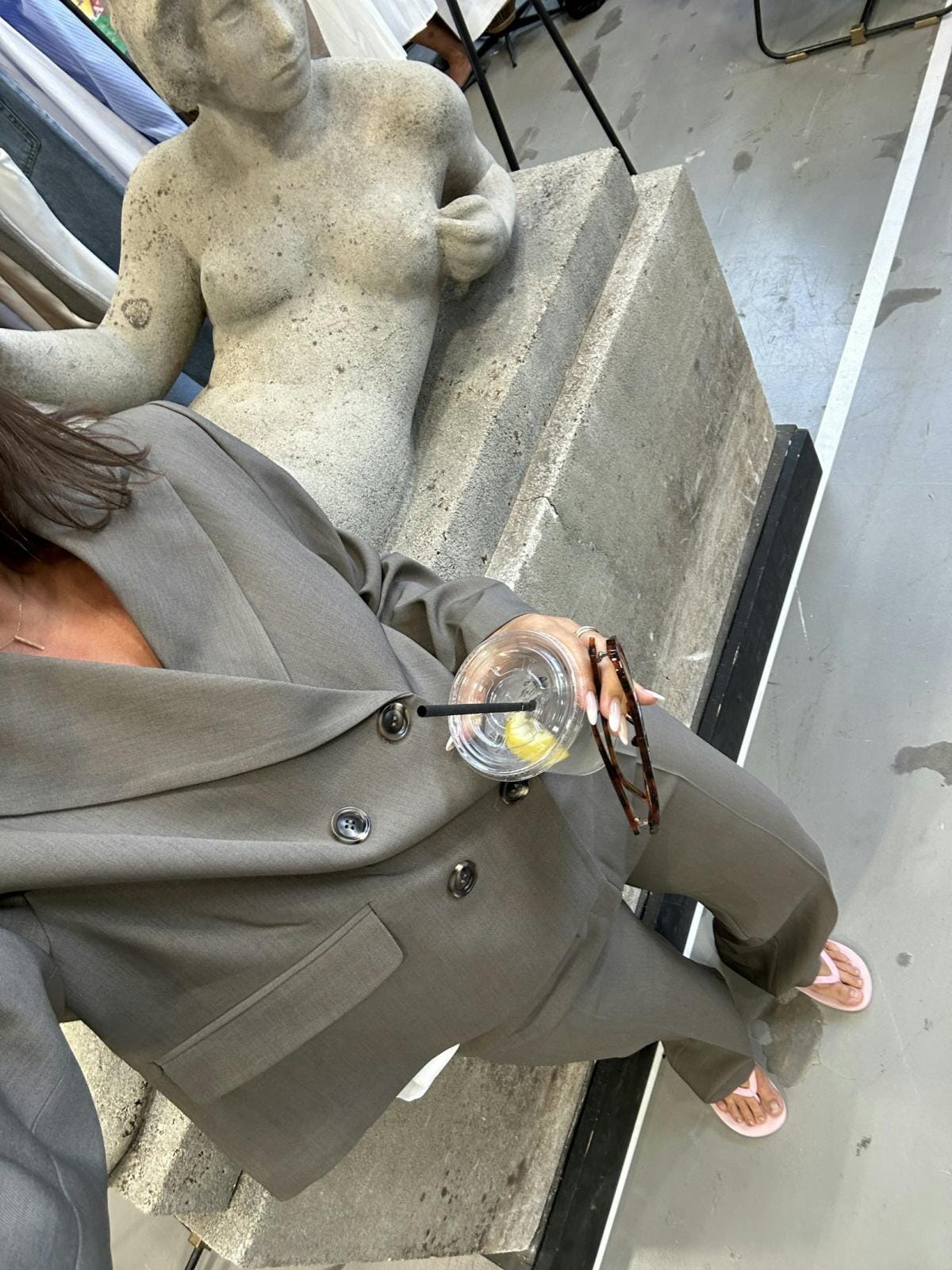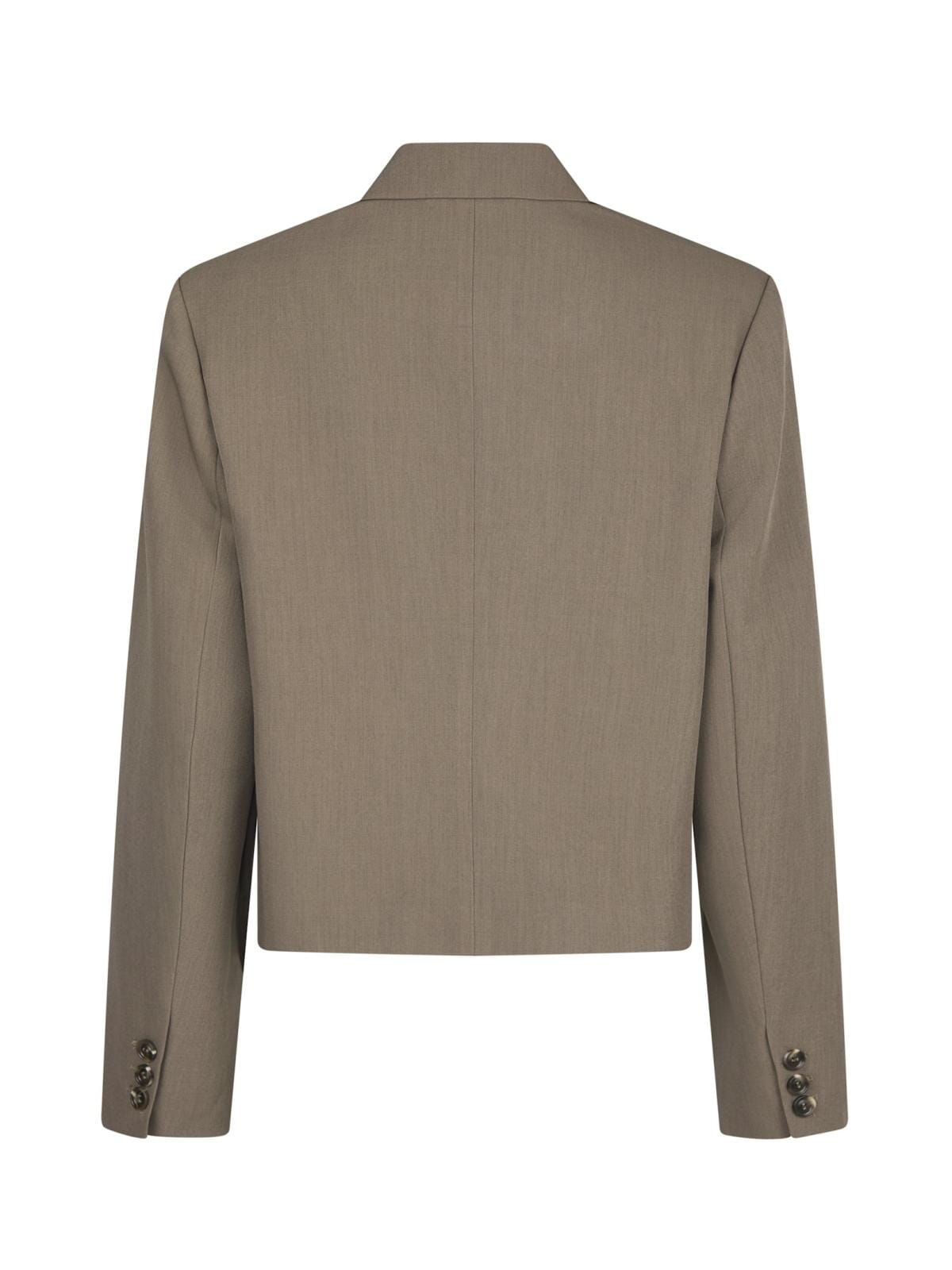 Khakifarbene Blazer von Neo Noir mit doppelter Knopfleiste. Ein strukturierter Blazer mit V-Ausschnitt und langen Ärmeln, der sowohl für den Alltag als auch für Feste gestylt werden kann.