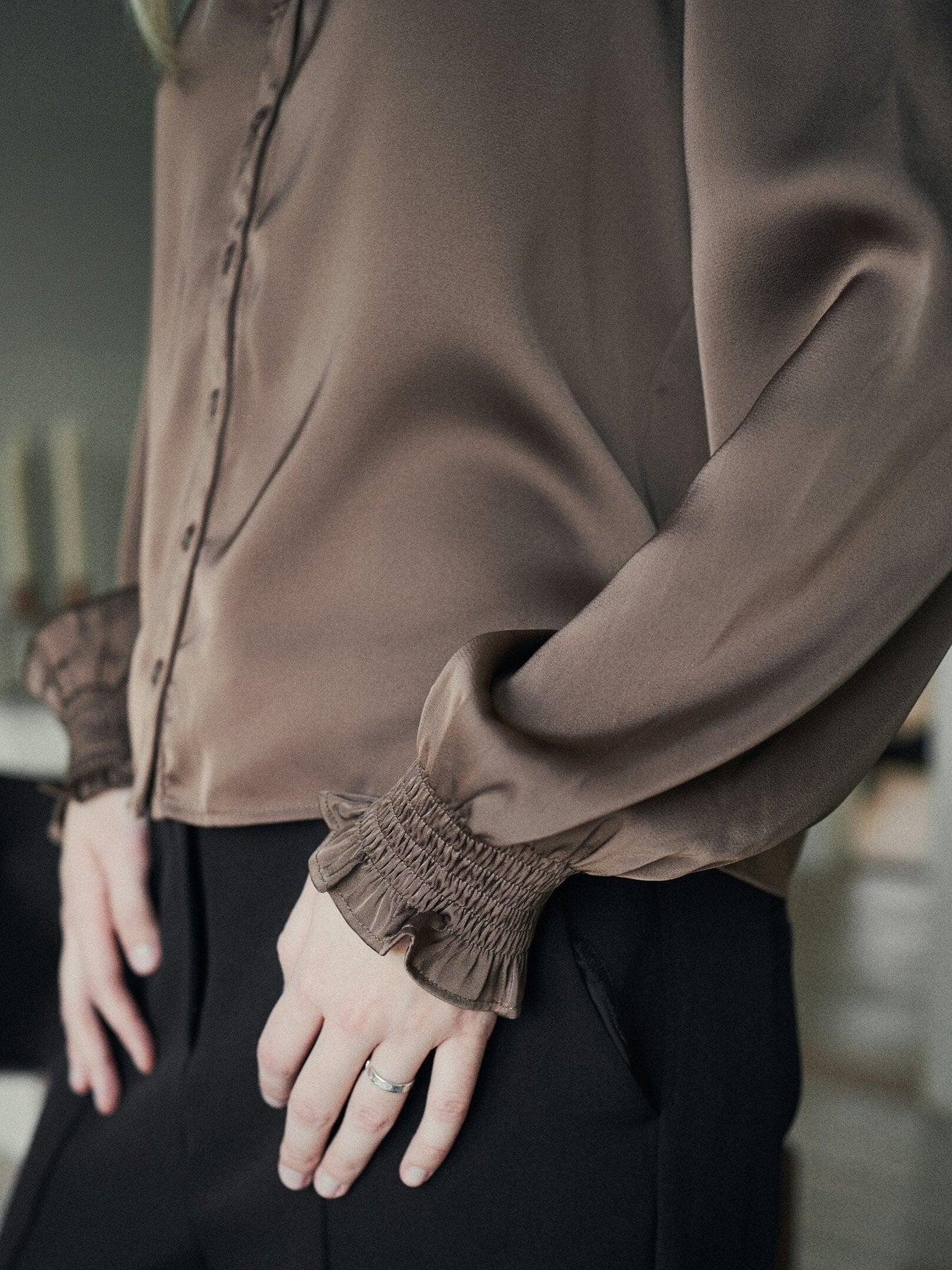 Satinbluse von Neo Noir in einem gedeckten Braunton. Die Bluse hat einen Rüschenkragen am Halsausschnitt und eine Knopfleiste vorne.