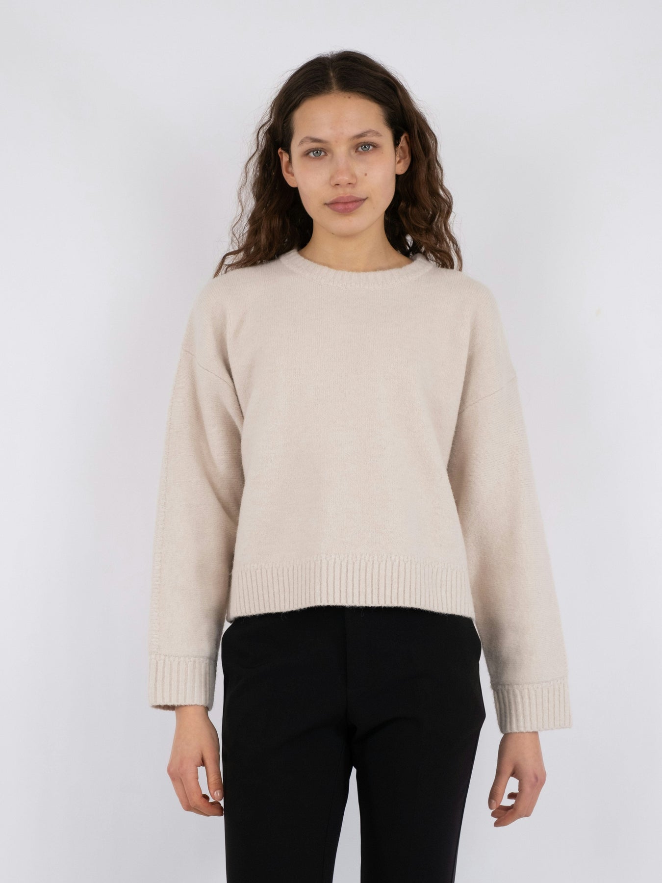Strickpullover von Neo Noir in Ivory. Sie hat eine lässige Passform mit abgesenkten Schultern und Rundhalsausschnitt. Der Pullover hat gerippte Kanten an den Ärmeln und am Saum.