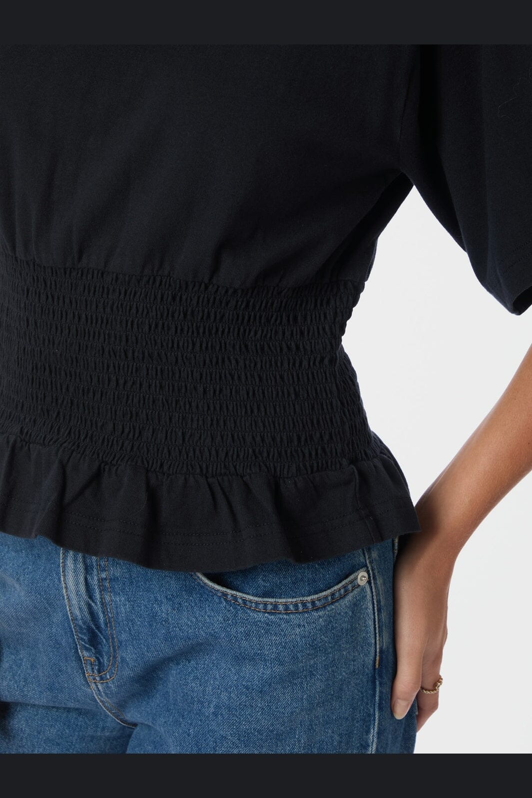 Dunkelblaue T-Shirt von Neo Noir mit boxy Passform und Smock-Detail in der Taille. Sie ist aus weicher Baumwollqualität gefertigt und hat kurze Ärmel sowie einen runden Halsausschnitt.